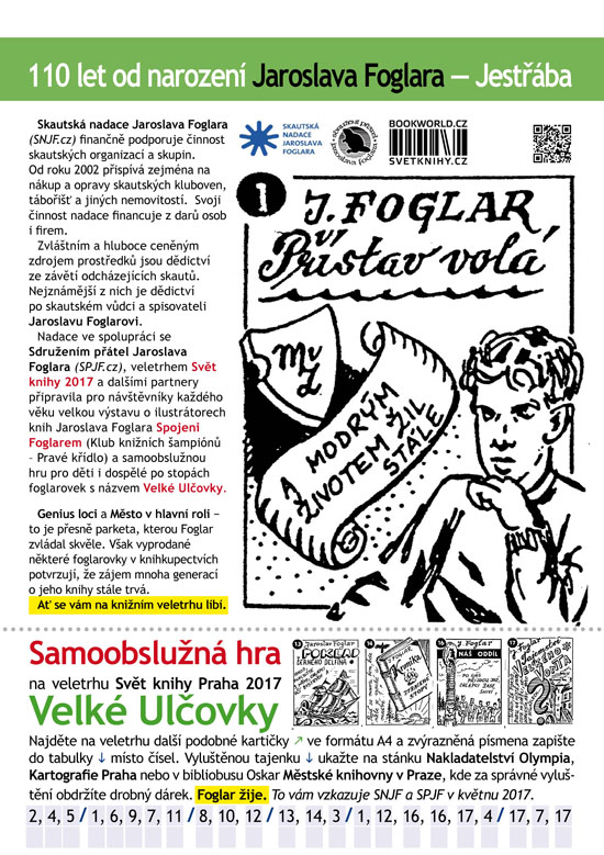 Od čtvrtka do neděle 11. až 14. května 2017 proběhnou tři větší aktivity k připomenutí 110. výročí narození spisovatele Jaroslava Foglara. Všechny spoluorganizuje SPJF. Výstava Spojeni Foglarem začne slavnostní čtvrteční vernisáží. Po celou dobu veletrhu bude probíhat také hra Velké Ulčovky. Určitě přijďte.