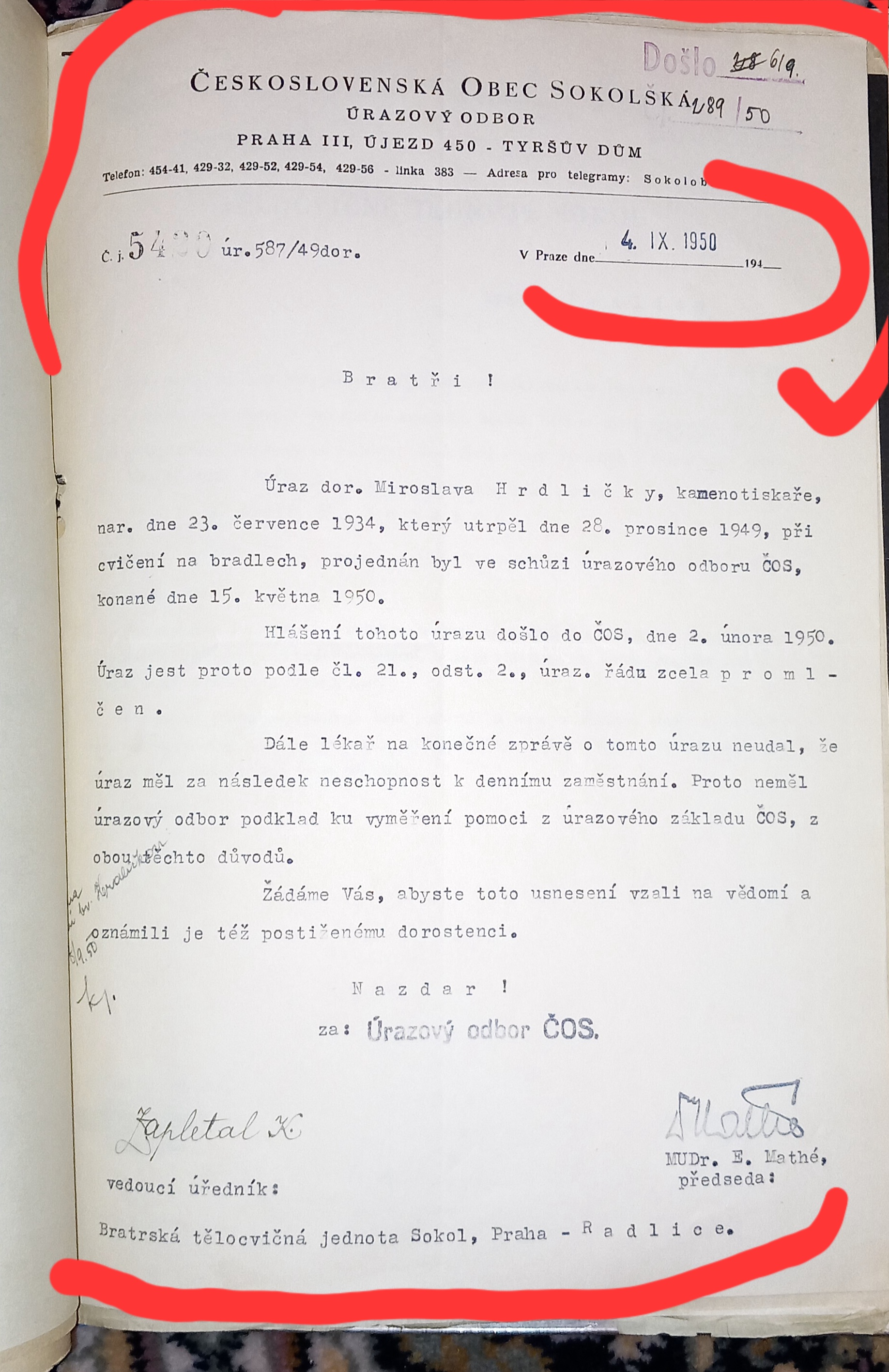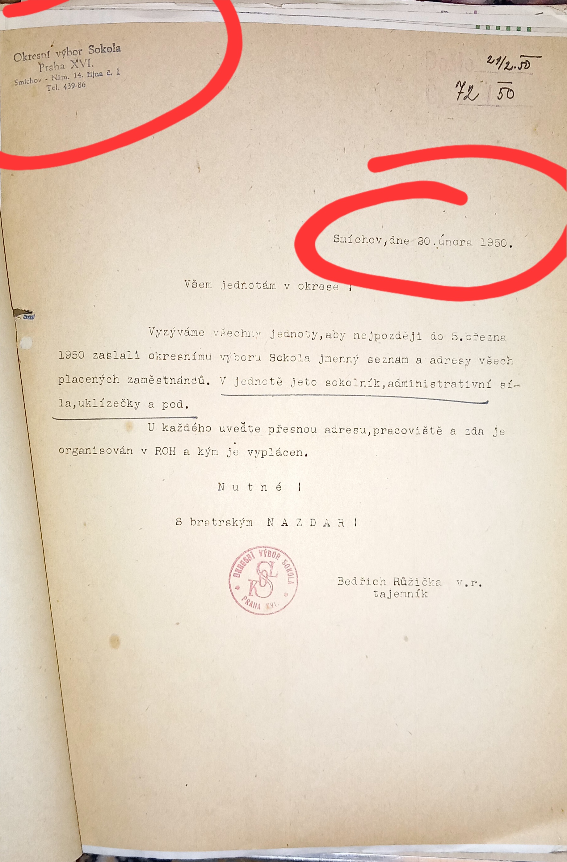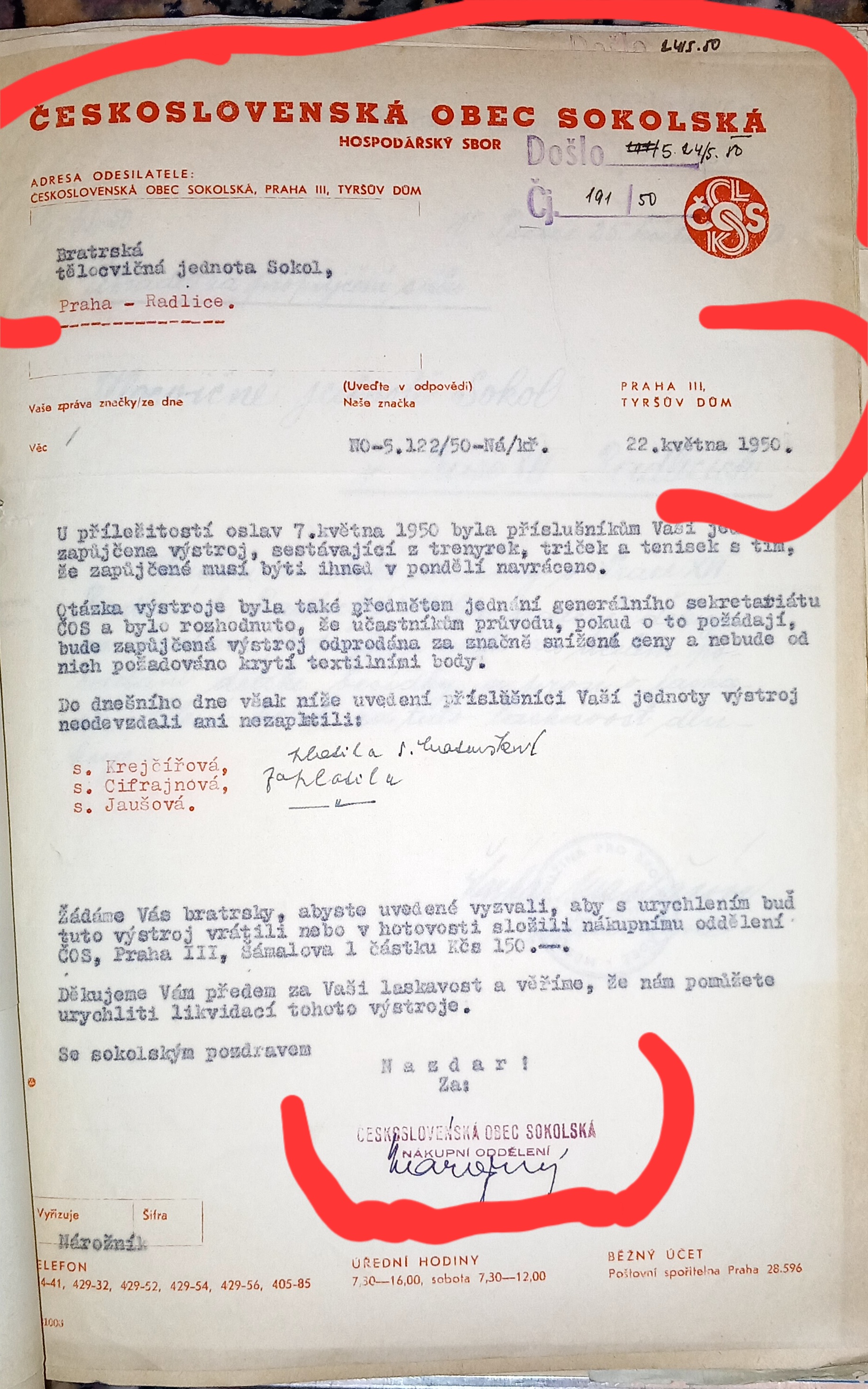 Využívám možnosti ofotit a publikovat některé sokolské archivní dokumenty z doby až po příchodu Foglarova oddílu do Sokola (v roce 1949), které ukazují, jak se organizace jmenovala. Určitě Sokol už nebyla organizace jako za Tyrše - komunisté utahovali opasky všude a tedy i v Sokole vznikly akční výbory, muselo se třeba hlásit, kdo má slavnostní sokolský kroj a tlačilo se, aby šli sokolové do prvomájového průvodu atd. atd. Ale stále se to jmenovalo (v roce 1949 i pár let později) Sokol.