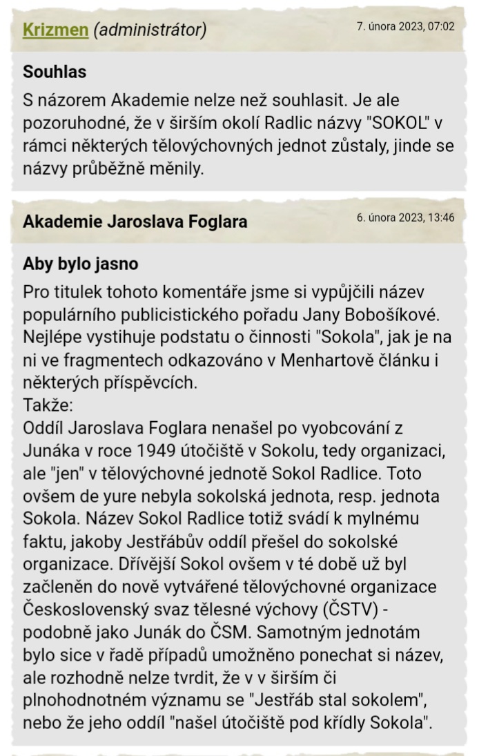 Myslím, že je zřejmé, že Akademie Jaroslava Foglara se s ČSTV mýlí a považuji záležitost za vyřízenou. Přikládám ještě zajímavost, kdy se v roce 1951 cpal do názvu radlické jednoty vetřelec, který nakonec zvítězil a Foglar i oddíl i tento název musel akceptovat.