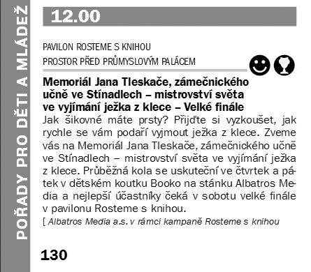 Memoriál Jana Tleskače - zámečnického učně ve Stínadlech - Mistrovství světa ve vyjímání ježka z klece, veletrh Svět knihy 2019