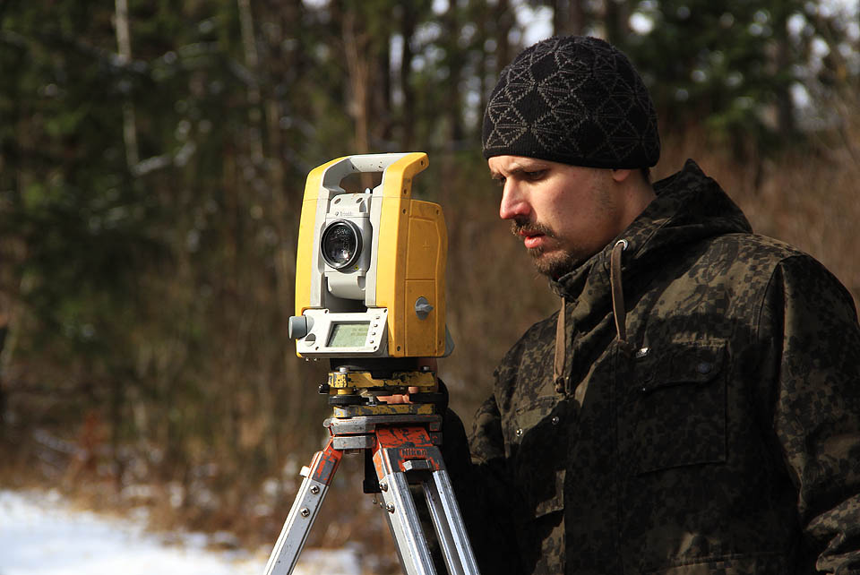 | Ing. Vojtěch Hanuš při práci geodeta. Před objektivem: Muna. |