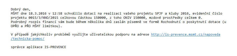 | Pro rok 2016 podpořilo MŠMT aktivity SPJF částkou 150000 Kč. |