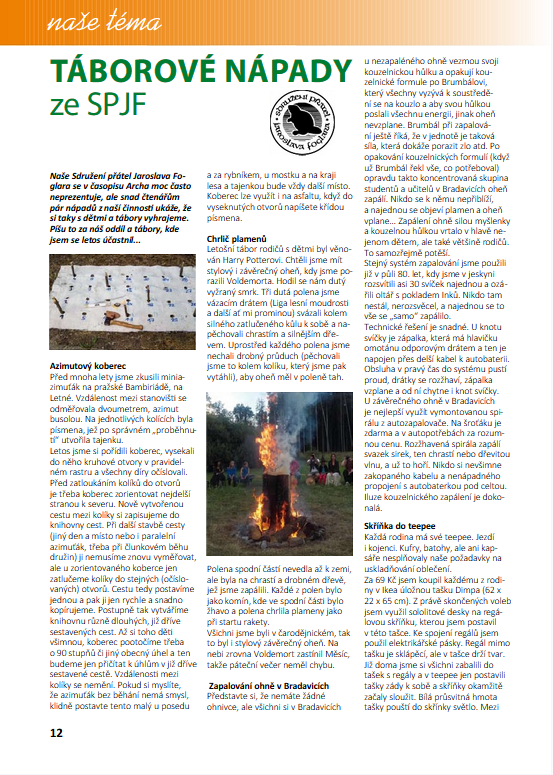 Ortodoxní táboření uznávám, ale jako už nejezdím s usárnou do jehlánku, tak s věkem pohodlním a s dalšími rodiči přemýšlíme, jak sobě i dětem a vnoučatům usnadnit udržování pořádku ve stanu, jak puberťáky na táboře usadit zase na zadek a jak rychle postavit azimuťák. Tábory jsou velkým zdroje radosti a nápadů. Tak jsme v říjnovém časopisu Archa trošku nechali nahlédnout čtenáře do radosti na táborech u nás ve Sdružení přátel Jaroslava Foglara, člena ČRDM.