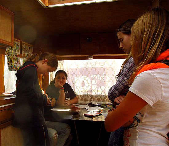 Doplň text, který byl napsán v bublině na karavanu: "Dostali mě, ..."