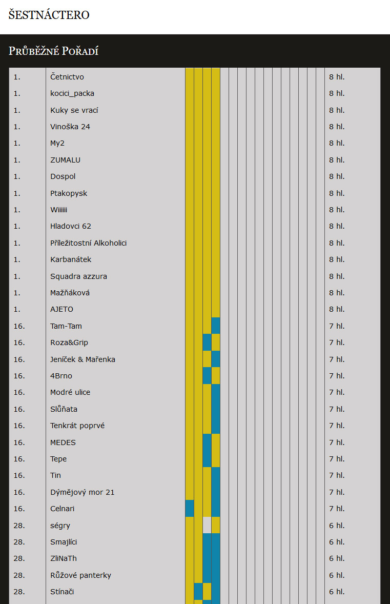 Registrace, průběžné výsledky a obrázky skrýší jsou dostupné na webu soutěže www.sestnactero.cz.