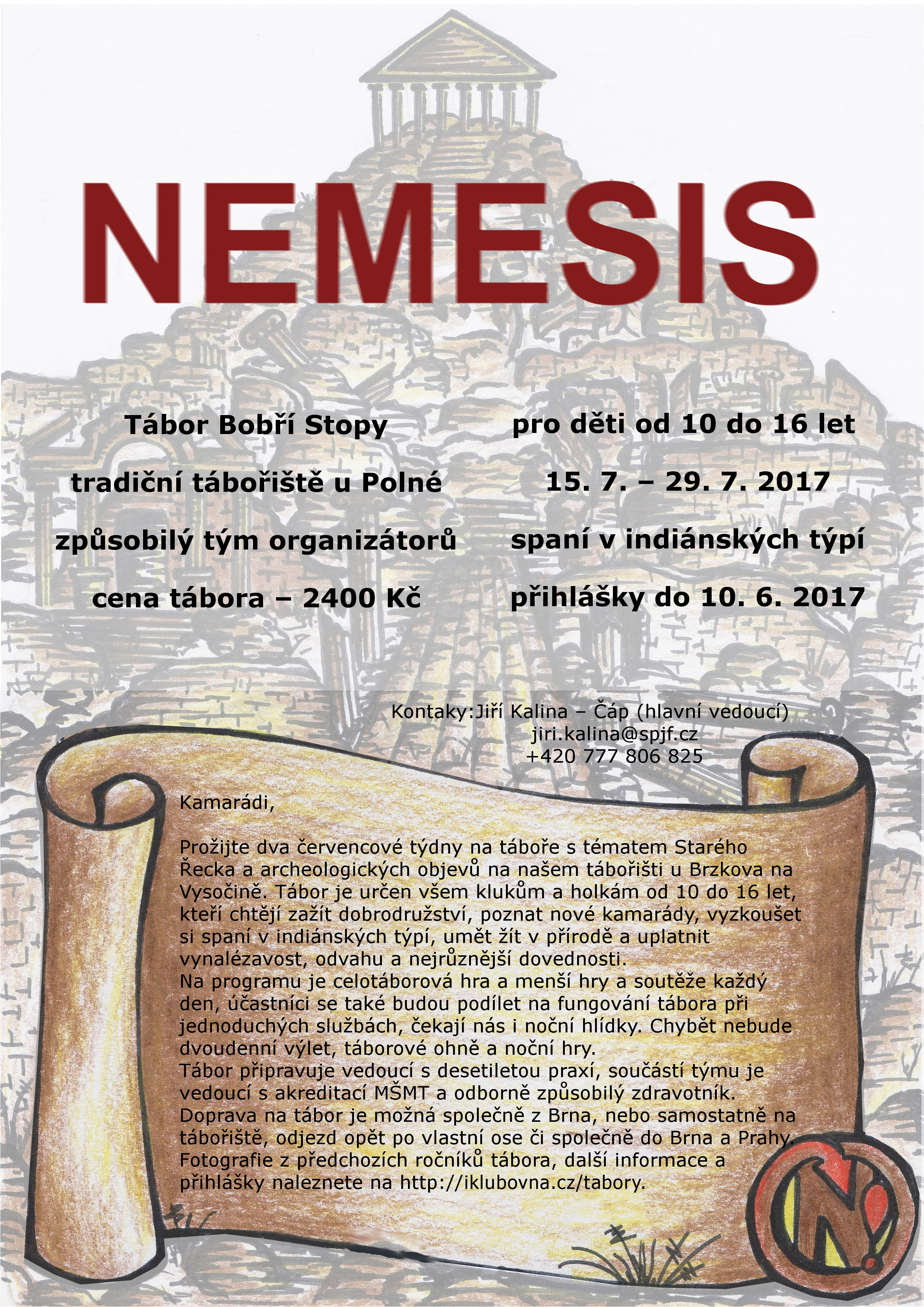 Nemesis, jméno řecké bohyně pomsty, je také název našeho letošního tábora, který bude zaměřen na řeckou mytologii. Ale nebojte se, nebude to žádná školní nuda, naopak, všichni si užijte spoustu zábavy za jakýchkoliv podmínek. Chcete se... (pokračování)