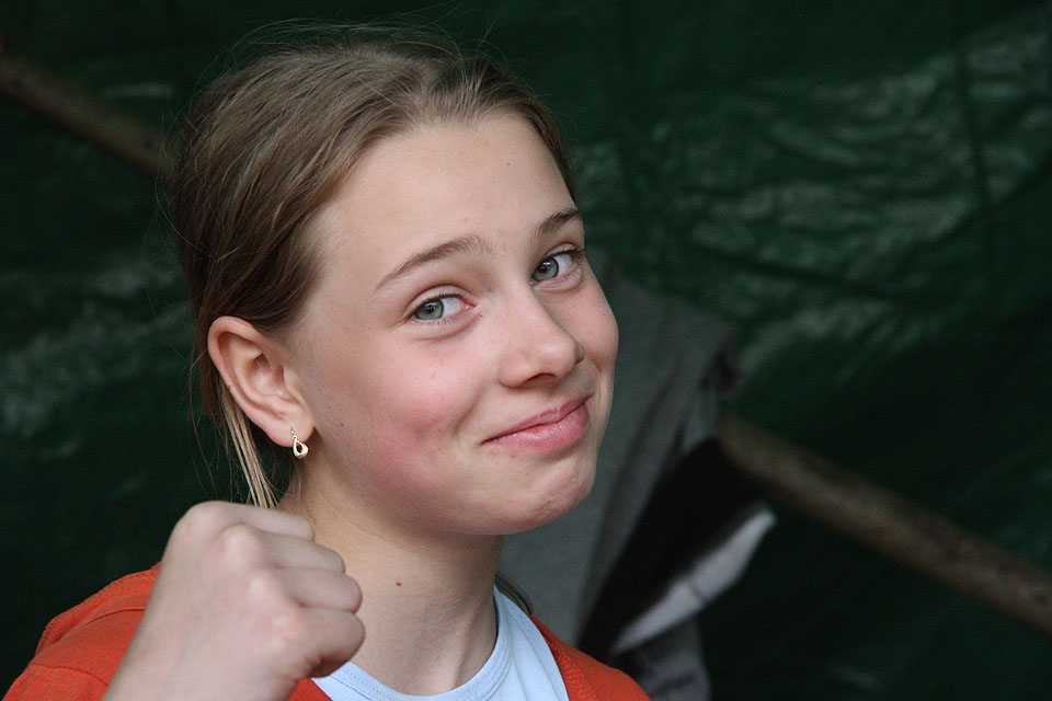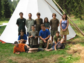 A tady už jsou všichni pohromadě - účastníci i vedoucí v plné táborové sestavě. Zejména díky Voltovi a Anežce, kteří pozdvihli z prachu klub (a nyní oddíl) Tygří dráp, je letos táborníků rekordní počet: 22.