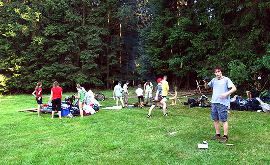 Odjezd byl, jako obvykle, plný zmatků a tak jsme na tábořiště dorazili až za setmění. Od vesnice se cesta svažuje dlouhým mělkým údolím a příchozího každým metrem pohlcuje větší a větší ticho. Nakonec zmizí všechny dojmy z civilizace a na malé loučce dokonale ukryté v hlubokých lesích zůstane člověk sám jen s jednoduchou dřevěnou kuchyní, zurčícím potůčkem a šuměním lesních velikánů. Smolnou vůni lesa jsme si ale neužili - hned po příjezdu na nás zaútočily bzikavky dešťové [hovada] a proto Jerry obratem odjel ve vypůjčené dodávce zpět do Brna a na louce zůstali jen Drobek (hlavní vedoucí tábora), Sova (vedoucí tábora) a Čáp (letos už jen stavěčkář). Někdy okolo půlnoci se přibelhal taky Svišť 2, kterému nešel stop a tak musel z Hradce Králové dojít pěšky.