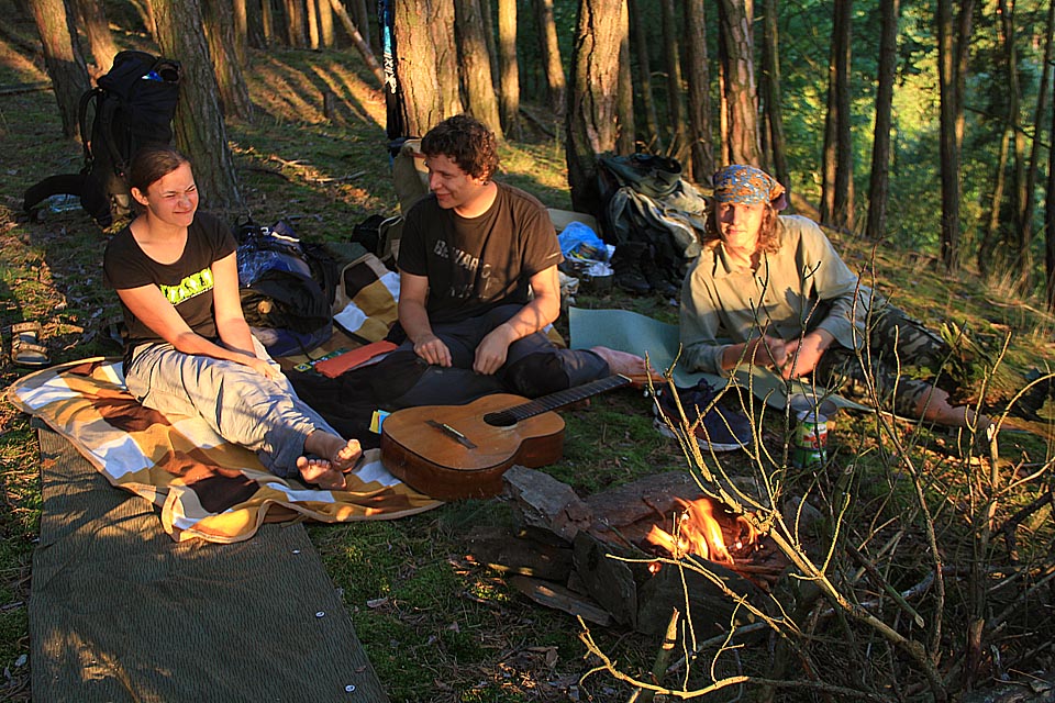 Romantický večer u ohně s kovbojskými fazolemi a písničkami od Ryvolů, Červánku, Ozvěny i Hop tropu jsme strávili v borovém lese nad Velkým Pardouskovým rybníkem na půli cesty z Plzně do Mostu.