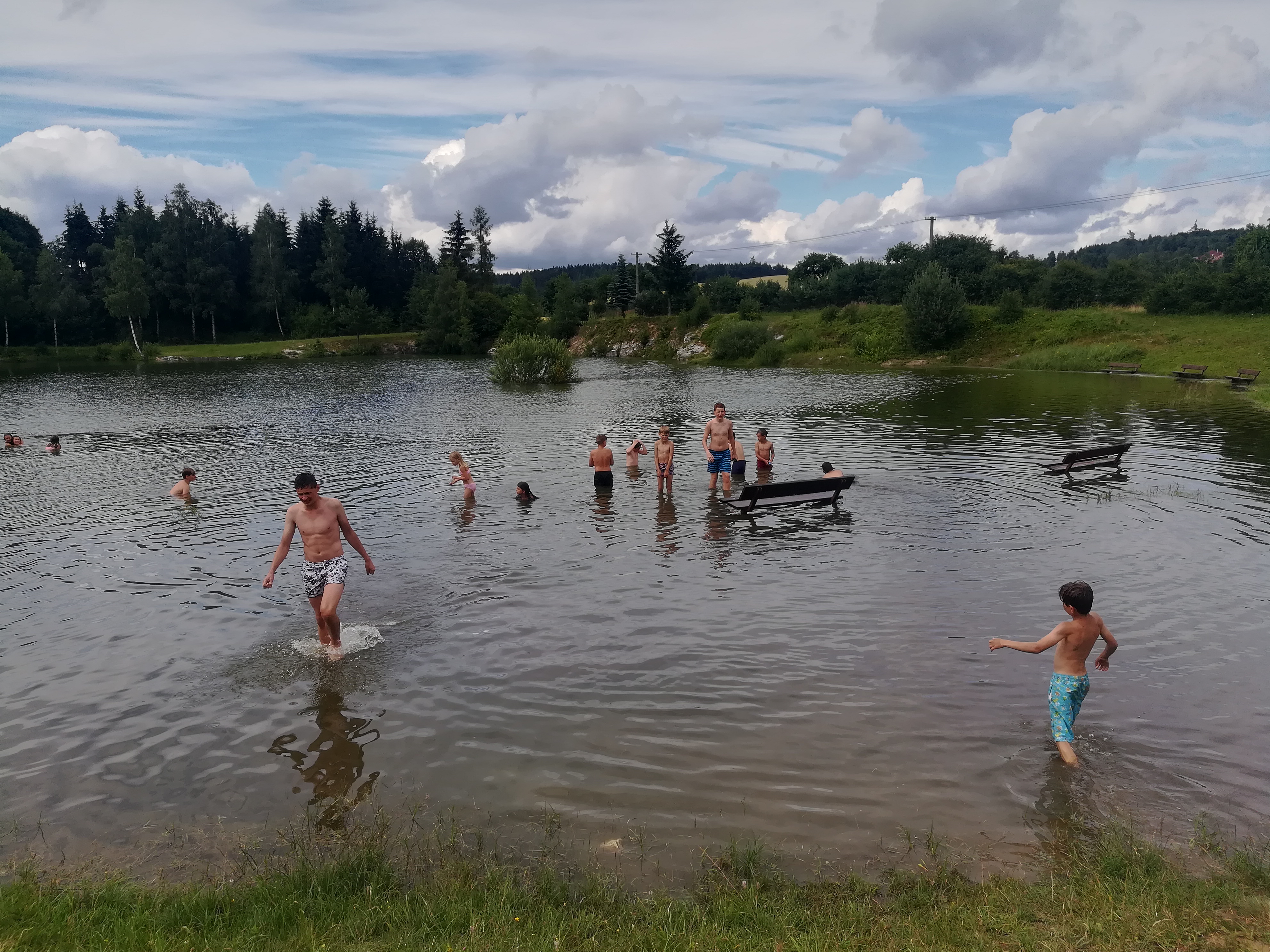 S uspokojenými žaludky jsme dojeli až do Dolní Rožínky, kde je náš známý lom a kde nás nikdo pouštět nemusí! Všichni se náležitě umyli a jeli s Kubou do tábora. Na ty, kteří byli trpěliví a zůstali u lomu nejdéle, čekala pěkná podívaná na zápas pana rybáři s majestátním kaprem! Měl asi 75 cm, ale prý je tam i jeden 95 cm. To nám pověděl právě pan rybář, který kaprovi vyndal háček, pohladil ho a pustil ho zpět. “Můžu se prosím na něco zeptat?” ptal se uctivě ohromený Šimon, “proč jste ho pustil zpátky?”