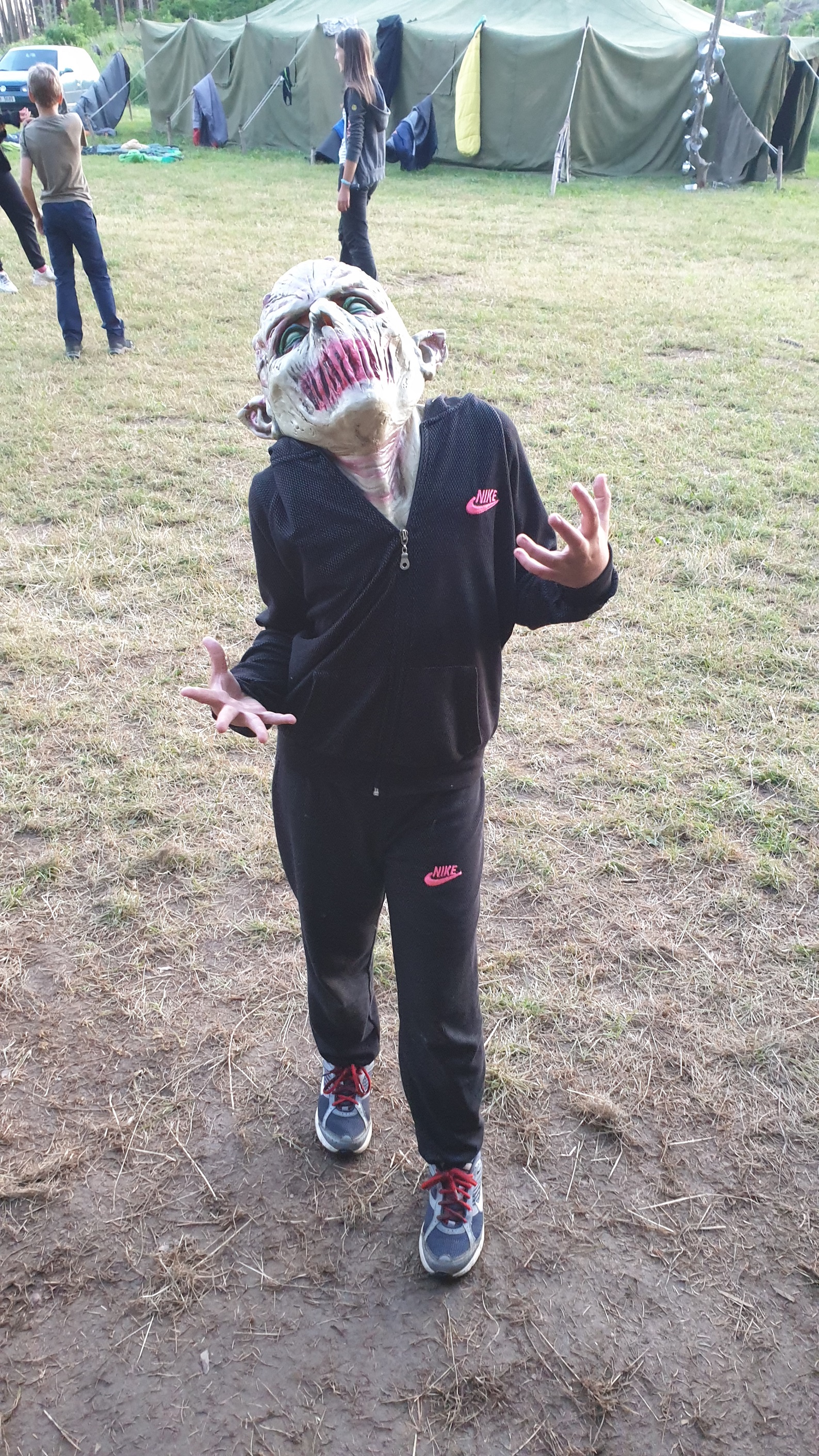 Večer nás čekala fantastická věc! Táborové nádvoří se proměnilo ve čtvrť Boschenbergu, jednoho z městeček císařství. Hemžilo se ne vedoucími a táborníky, nýbrž příběhovými postavami – Lovcem příšer s živou trofejí, tajemným kejklířem, velkohubým obchodníkem, vzdělaným doktorem, pyšným úředníkem, obecním bláznem, sličnou ocťačkou, pánem dvou jedovatých šavlí – Sabrinem… A hromadou sirotků! Naplno jsme se vnořili do naší fantazie a všichni jsme hráli svou roli. Sirotci klábosili s postavami, zjišťovali jejich příběhy, žadonili o drobné práce a pár zlatých, řešili malé úkoly i jeden velký! Snažili se totiž mezi postavami objevit vražedného měňavce, příšery, která umí měnit podobu. Postupně přišli sirotci na to, že nejjistější cesta je opití lovce a následné osvobození jeho příšery z řetězu…ta totiž svým jemným čichem rozpozná člověčinu od měňavce. Nakonec měňavce objevili, i když už stihl, navzdory zarputilé pozornosti Hanky, zamordovat obchodníka s ocťačkou i lovce příšer. Po vyčerpávajícím zápase pak měňavce dorazil Marek – ne snad tím, že chudáka příšeru v čele ostatních zalehl a statečně držel vší silou, protože i přes onu hordu těl se měňavec vesele mrskal a koukal kde nechal tesař (či sirotek) díru a kudy upláchnout. Markova překvapená a téměř uražená věta “Niekto mi sedí na zadku,” však měňavci sebrala poslední zvyšky dechu i bojovnosti a po překonání záchvatu křečí pak už jen zaklepaly nožičky a bylo po parádě. Soud nakonec přinesl vrahovi smrt; to už ale byla vzhůru asi jen třetina nejodolnějších sirotků :-))