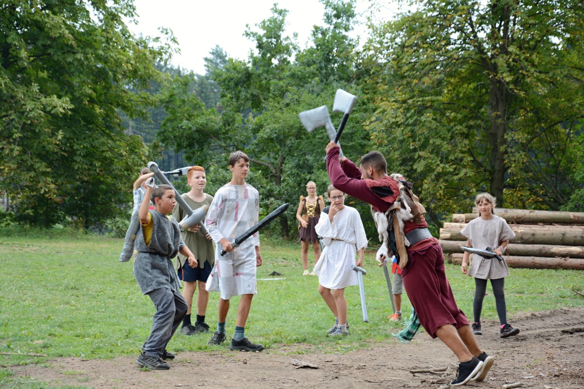 Byl čas se znovu obléknout do kostýmu a chopit se meče! V další hře, která se udála v horním lese a měla znovu bojový charakter, zápletkou bylo, že milým vikingům došly zásoby medoviny (kterou jsme mimochodem všichni pili u každého táboráku, ale nelekejte se, milí rodičové, jednalo se o výborný, leč nealkoholický, nápoj Masala!). Naštěstí se dozvěděli o lokacích obchodnických karavan, které potřebné druhy koření a med převážely, přičemž další ingredienci – líh, mohli dostat pouze od po zuby ozbrojeného lihovarníka Ríši. Děti tedy dostaly recept na medovinu, který udával potřebný počet a kombinaci surovin na vyrobení jednoho sudu medoviny, a měly za úkol jich vyrobit co nejvíce. Loupení jim ztěžovali strážci karavan, kteří jim nic nedali zadarmo! Při hodině potu, sprintů boje a řevu jsme se všichni dostatečně vydováděli a čekal nás trochu klidnější program.