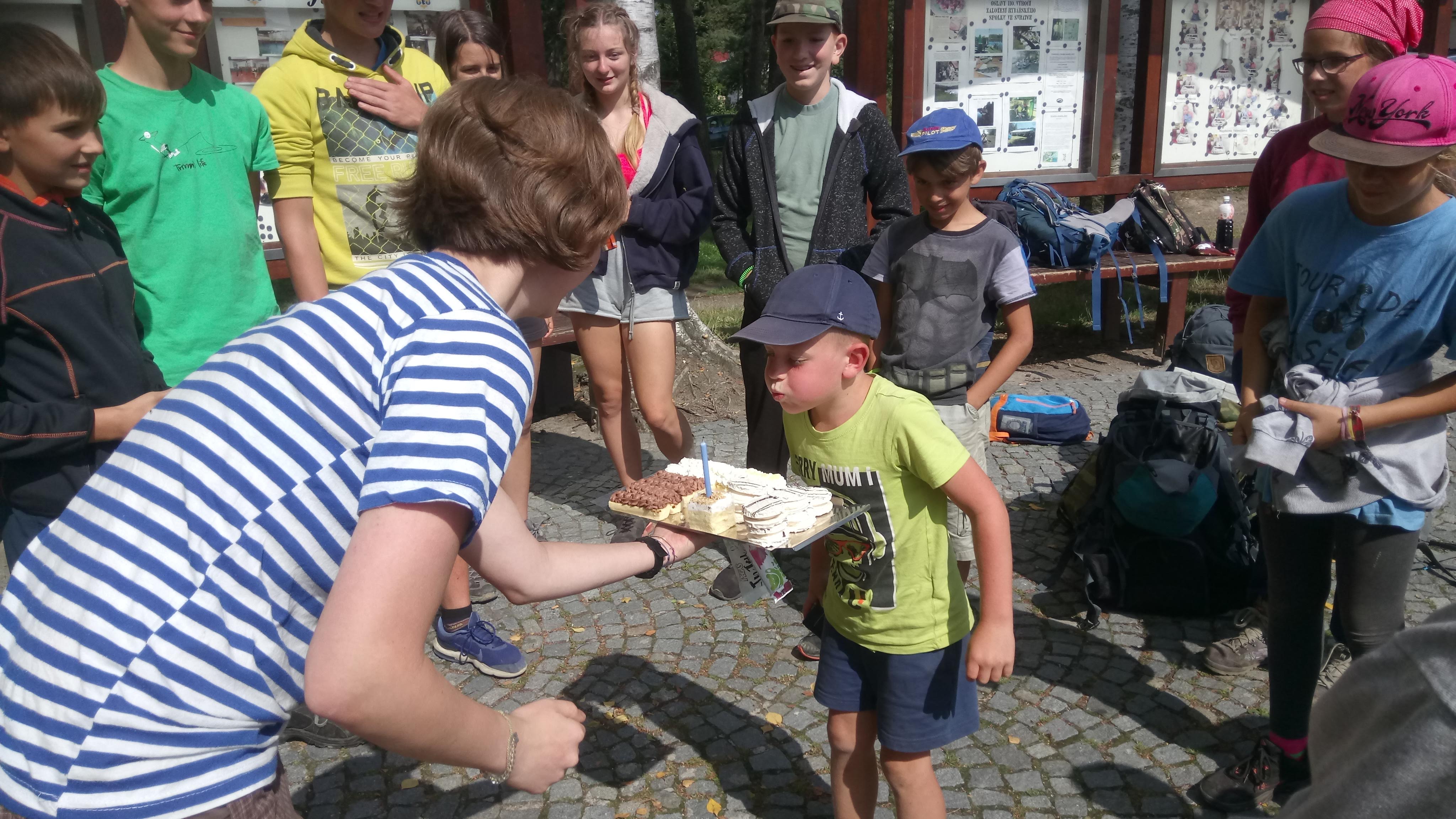 Závěrečkové ráno středeční proběhlo docela ve spěchu, každý si sbalil vše potřebné, přidělilo se jídlo a už už jsme vyráželi do Pikárce na autobus. Jeli jsme do Sněžné, zůstali jsme tedy na bohulibé Vysočině. Zde byl opět podniknut nájezd na obchod, přičemž se vedoucím povedlo i zakoupit hromadu zákusků a dokonce i dortových svíček – Jiřík totiž slavil jedinečných osm let! S rakvičkou a štědrou porcí šlehačky dostal jako dárek i sadu kostek, jelikož ho, jak se zdálo při celotáborovce, kostky zaujaly („hele teď mi padla pětka…tři…jedna…pět…pět…šest!...jedna...dva...dva… tři…“ nenáročné to dítě!).