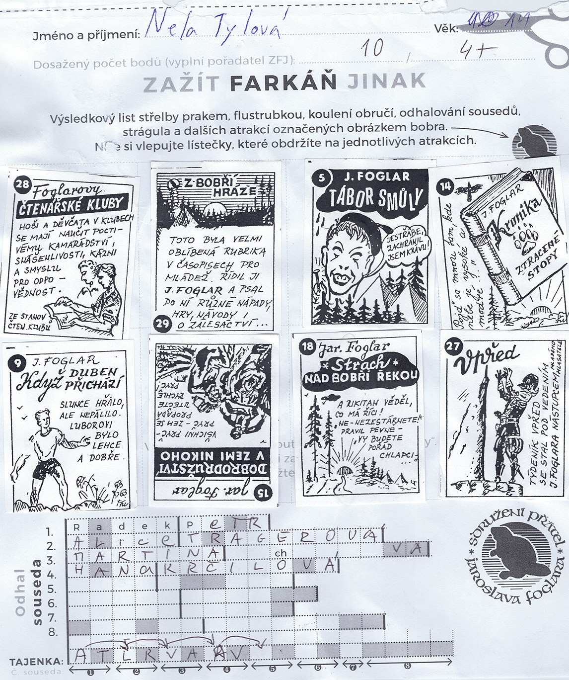 Hrací karta měla dole tabulku, kam hráči dopisovali zjištěná jména a vyplňovali tajenku.
