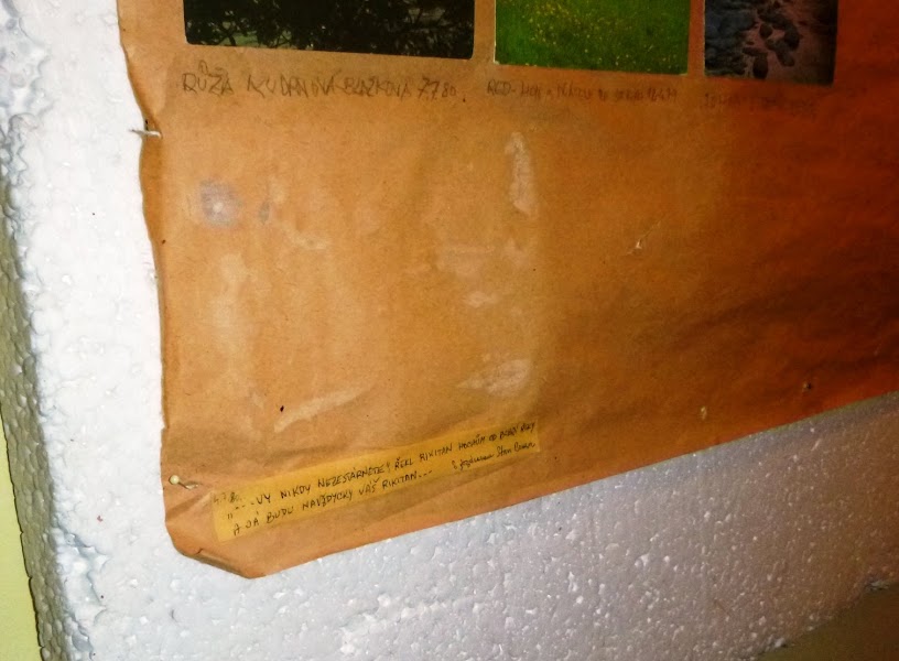 Na chodbě vedle dveří do pracovny (pokoj Pumíka) měl Jestřáb nástěnku s pohledy. Napsal si k nim odesilatele a také toto přání k jeho narozeninám z 4. července 1980.