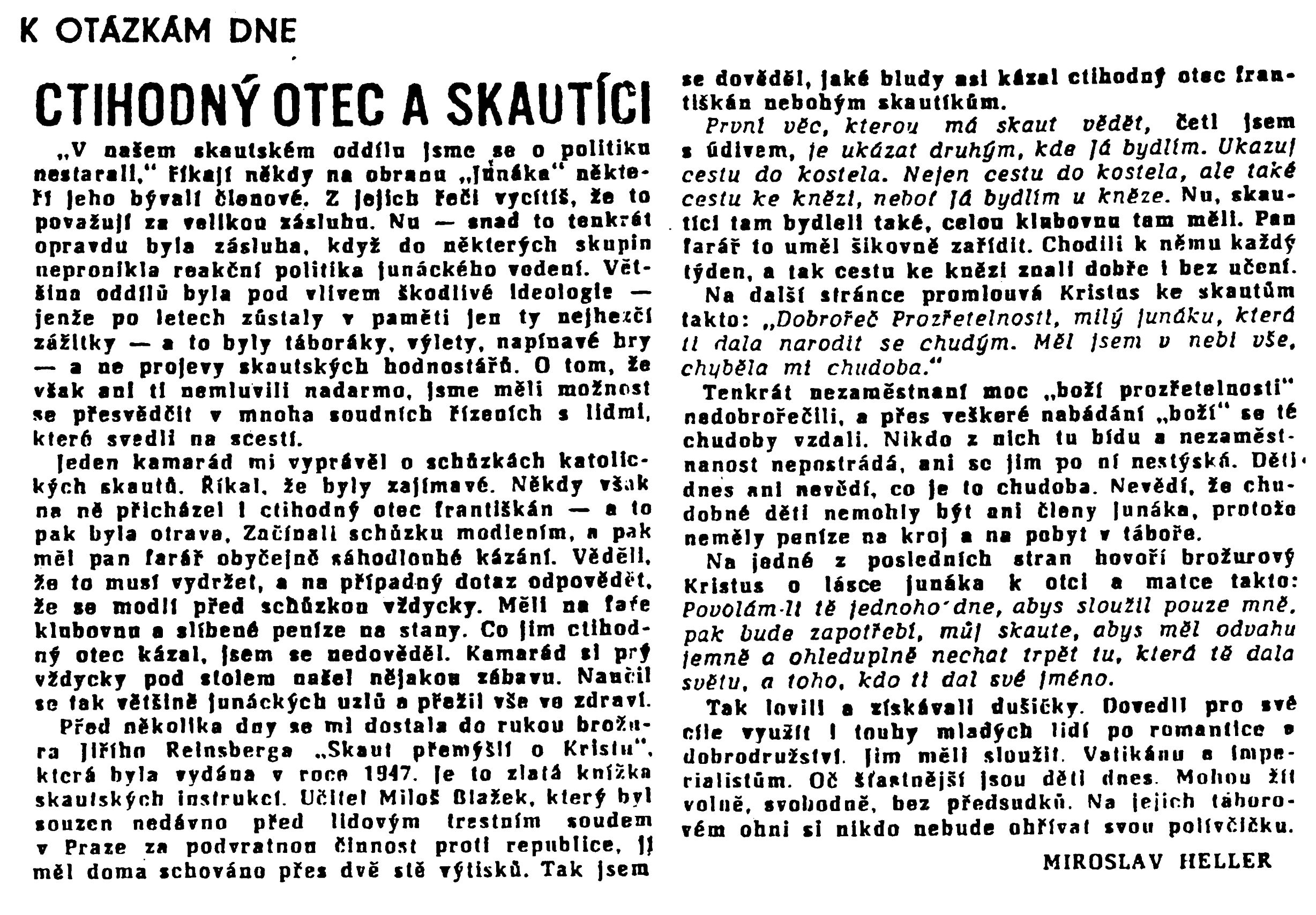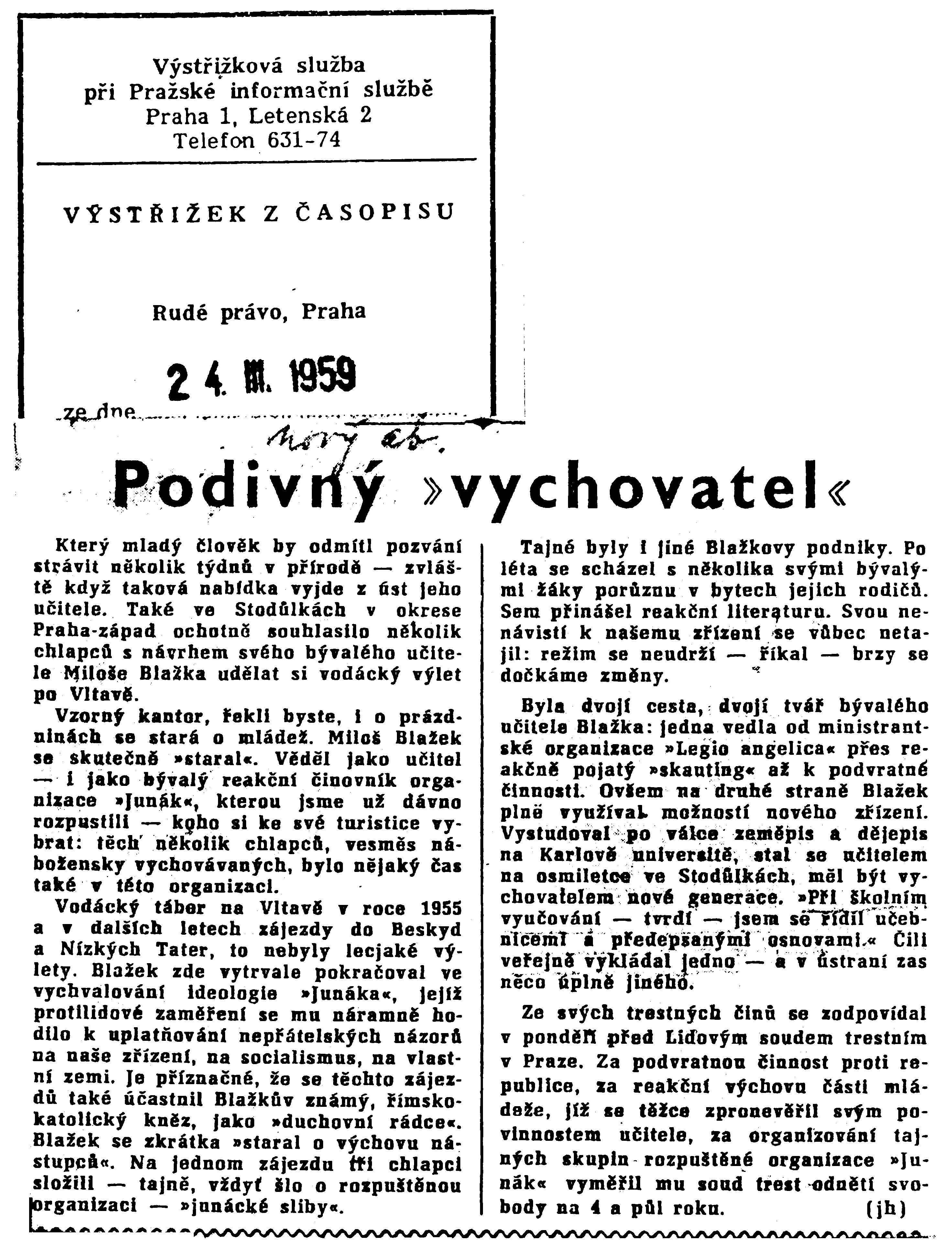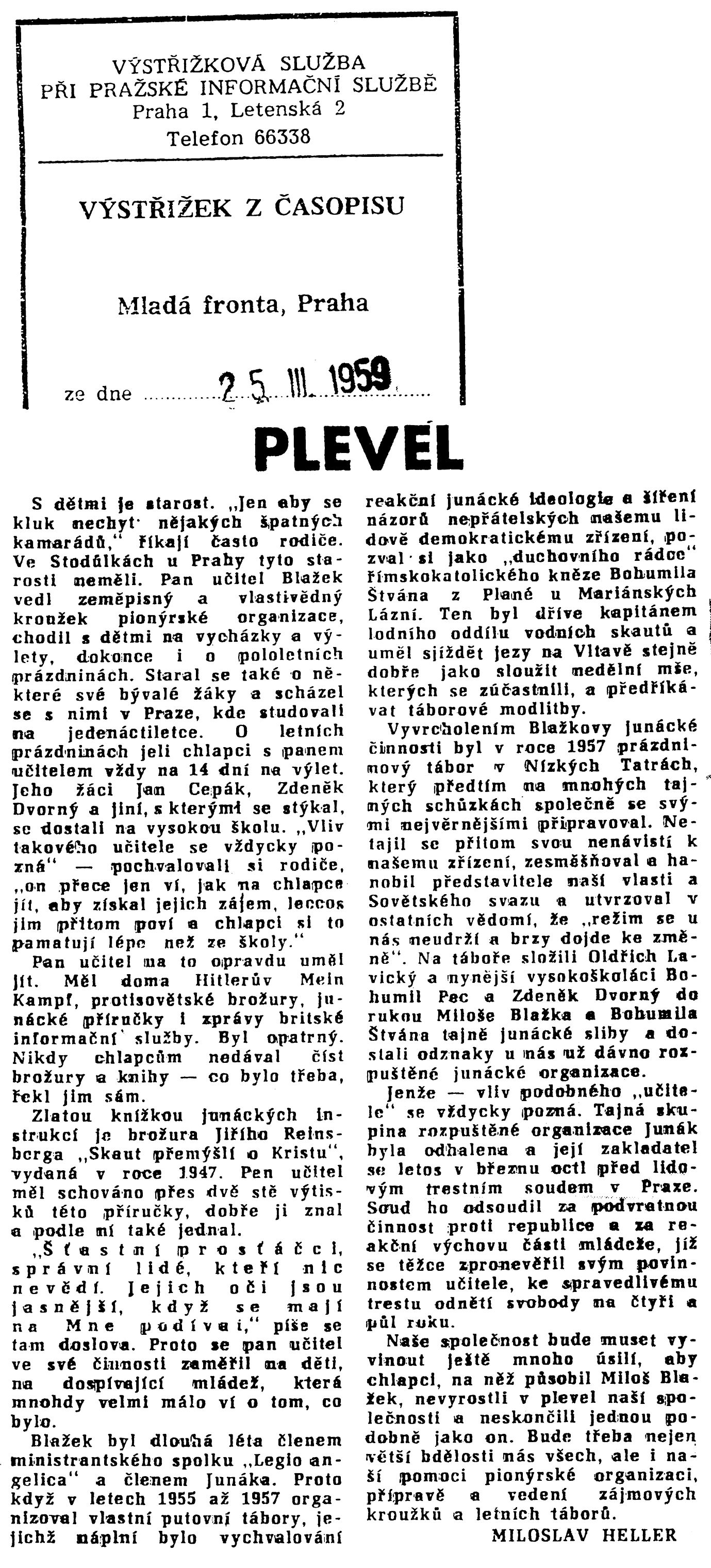 Jeden z nich říká: „K naší činnosti, i když byla nesprávná, nás spojilo stejné náboženské smýšlení." Hle, kam až vede rozpor mezi náboženstvím a vědou, rozpor mezi dvojí výchovou! Není to vykřičník pro ty vychovatele, kteří ještě stále věří, že „víra nemůže škodit“? A ještě jedna věc stojí aspoň v závěru za povšimnutí. Blažkova zrada se halila do nevinné formy turistické činnosti. Co to znamená? Ukazuje to, jak přitažlivá a lákavá je to činnost. Osvoboďme turistiku od tohoto nebezpečí tím, že ji pevně postavíme do služeb pionýrské organizace, které pomáhá i Československý svaz tělesné výchovy. Jsou to právě ty dvě organizace, kterých se bývalý učitel Blažek tolik štítil a před nimiž tak rafinovaně utajoval svou činnost.reakční
