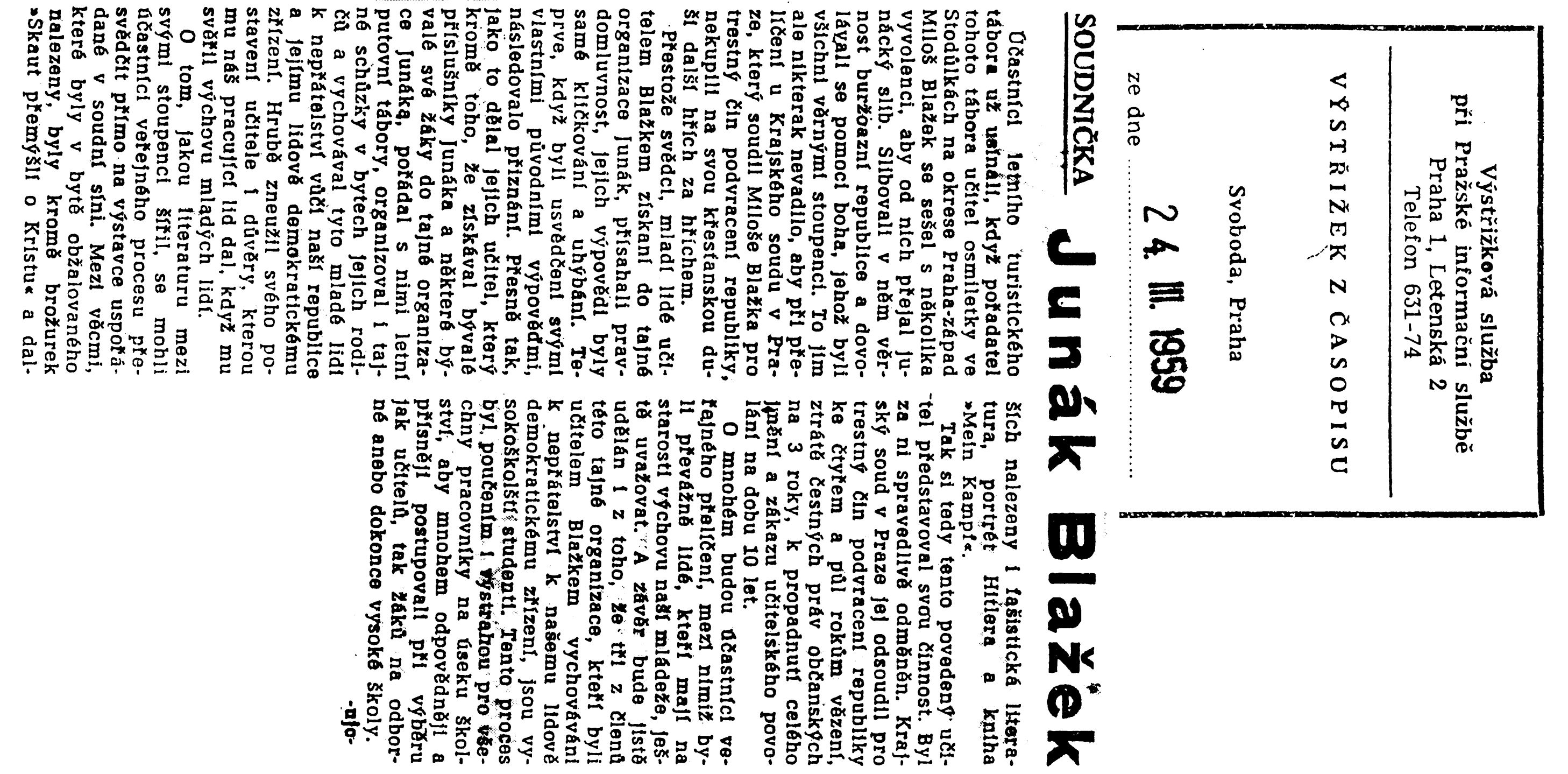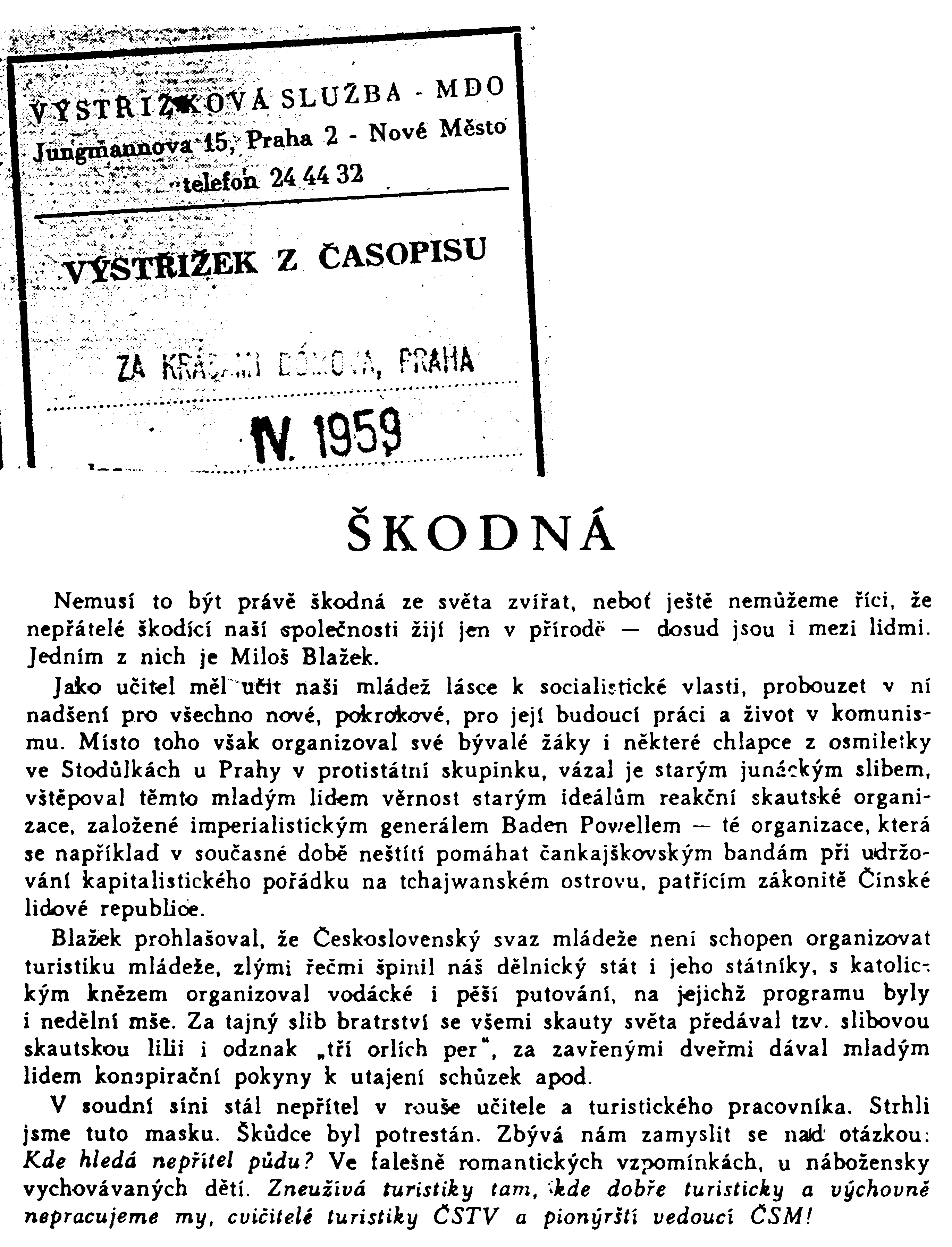 O tom, že nemůžeme podceňovat možnost zneužití turistiky ke křivení mládeže, svědčí proces, který se konal před krajským soudem v Praze. Bylo prokázáno, že učitel Miloš Blažek ze Stodůlek organizoval ze svých nynějších i bývalých žáků protistátní skupinu. Skautským slibem s doložkou „Tak mi pomáhej bůh!" zavazoval mladé lidi, aby „v každé době“ zachovali věrnost staré buržoazní republice. Dělo se tak ve spolupráci s knězem i jako duchovním rádcem tajného oddílu a na pozadí polní mše organizované v putovním táboře. Tento „putovní tábor" charakterizovala na jedné straně bohoslužba, na druhé anekdoty o socialismu a jeho představitelích. Blažek vytáhl a oprášil všechny symboly skautské organizace, slibovou lilii a odznak tří orlích per. Bývalý ministrant chtěl vychovat nové ministranty, vštěpoval jim odpor k socialismu, k lidovému Československu, k Sovětskému svazu a vychovával tak příští sabotéry v našem hospodářském i kulturním životě. Vydával svedeným chlapcům konspirativní pokyny o utajení schůzek v bytech rodičů, učil je lhát a přetvařovat se před spolužáky.