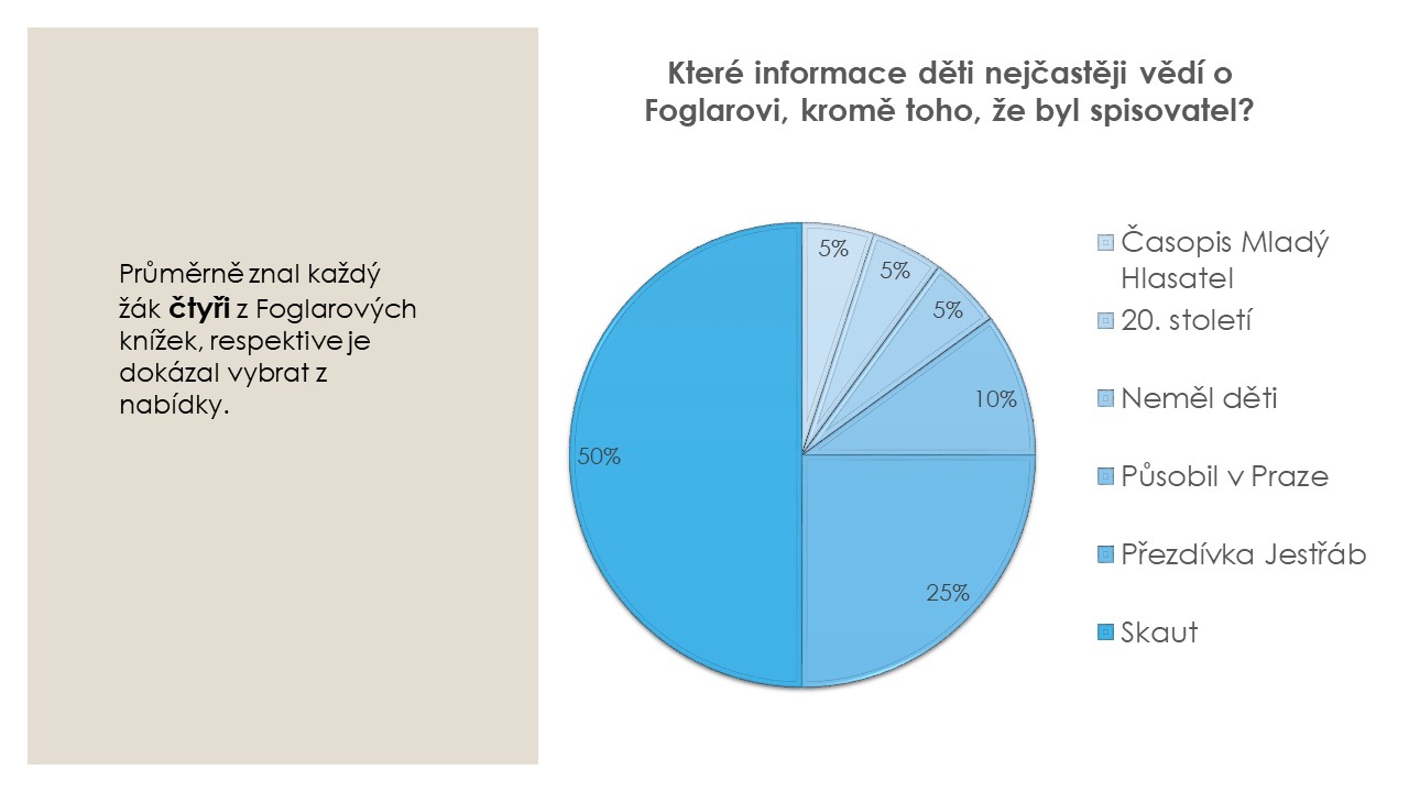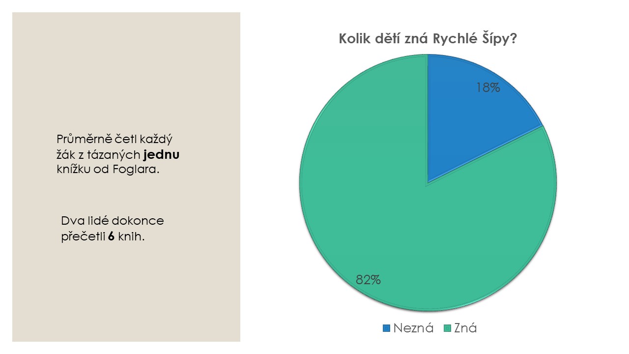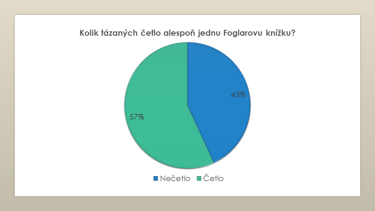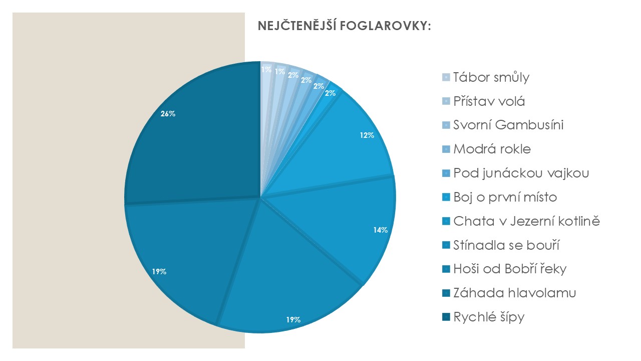 O výsledky zajímavé ankety, kterou sama navrhla v rámci diskuze na lesní škole SPJF, se s námi podělila Doubi z Kopřivnice. Žáků 8. a 9. tříd základní školy se dotazovala, zda a případně která díla Jaroslava Foglara děti znají a jestli jeho knihy také četli a čtou. Výsledky ankety uvádíme ve formě obrázků, které odpovídají původní prezentaci.