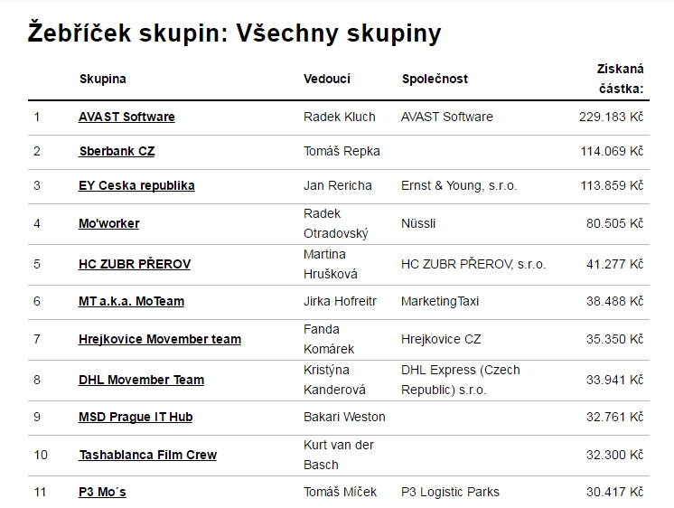 V týmu Movember se skautskými osobnostmi bylo 20 kníratých "přispívatelů" a skončili na 183. místě v ČR. V porovnání s širokou skautskou základnou nedopadl Movember s RŠ vůbec špatně. Nás bylo 13 a jsme 100. (asi 103, když ověřuji pořadí 17.12.).