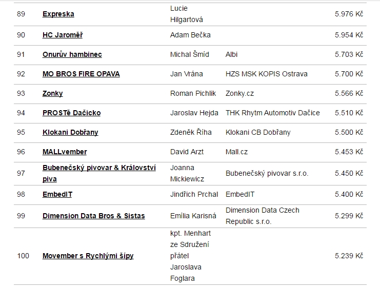 Nabízím post kapitána týmu někomu, kdo by se o akci chtěl příští rok starat. Je to dobrá zkušenost a možná by to chtělo zase další nápady, aby akce byla svěží a lákala další účastníky. Letos to byl 3. ročník akce a já to dělal už 2x. Děkuji všem 13 členům letošního týmu. Děkuji všem dárcům. Pomáhali jsme dobré věci a vůbec jsme si nevedli špatně.