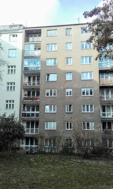Okna bytu Jaroslava Foglara jsou nahoře vlevo (lodžie s třídveřovým oknem a sítí proti holubům, trojkřídlé okna maminčina pokoje, dvojkřídlé okno kuchyně).