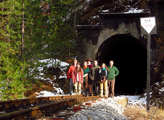 Sedm statečných cestovatelů se nezaleklo ani sněhové nadílky na Balkáně a společně během čtyř dnů prošli po trase legendární úzkokolejky ze srbského Stapari až do bosenského Višegradu. Zde společné foto na slavném tunelovém úseku u tunelu č. 38. Více o akci si můžete přečíst v tomto článku.