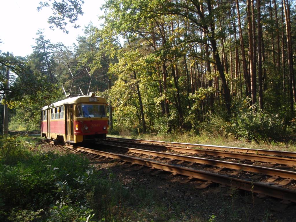 Tajemná lesní tramvaj jak z románů Michala Ajvaze se za svitu paprsků podzimního slunce prohání zapomenutými kouty Kyjeva.