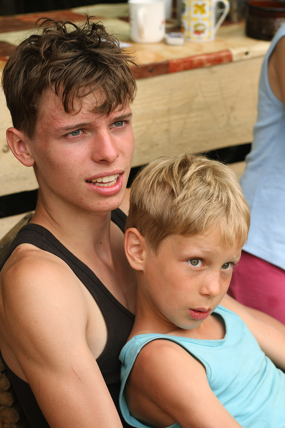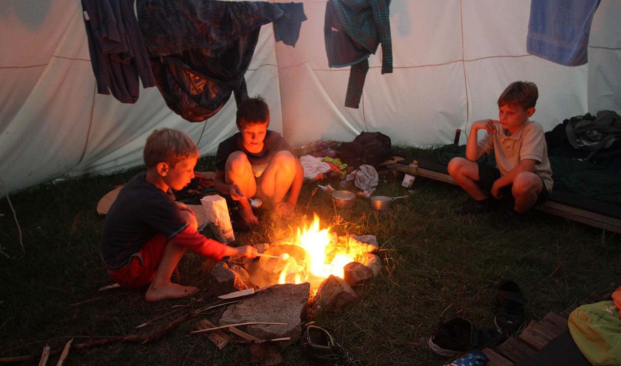 Protože vedení se letos nějak nepodařilo, museli si táborníci obstarat prakticky všechno sami. Zde například vidíme nebohé hladové chklapce, jak si ze zbytků plesnivých zásob klohní pod mokrými spacáky v týpí nad uhasínajícím ohněm hladové placičky.