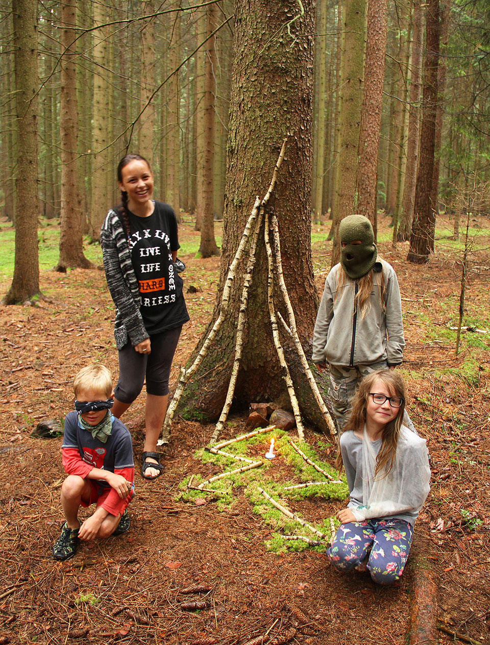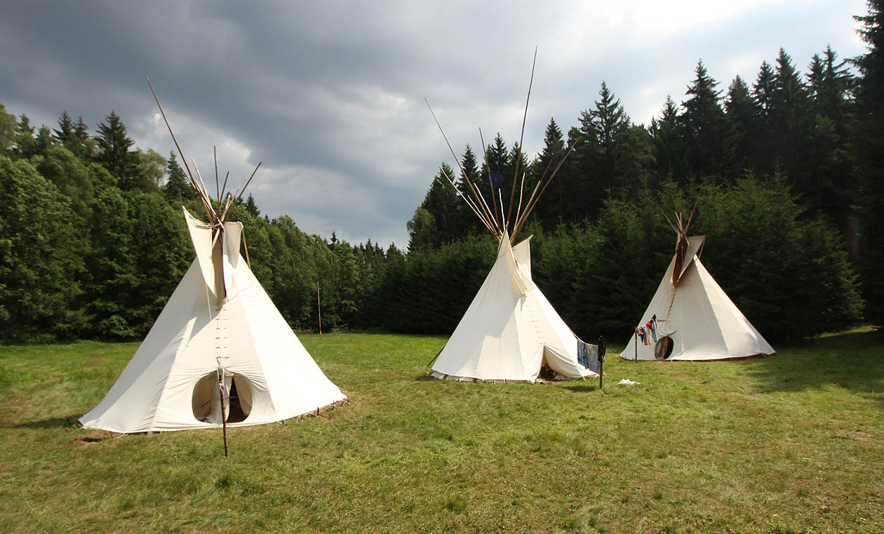 Týpí letos trucovala, a tak se každé natočilo vchodem na jinou stranu. To prostřední mělo navíc vchod nějaký divný.