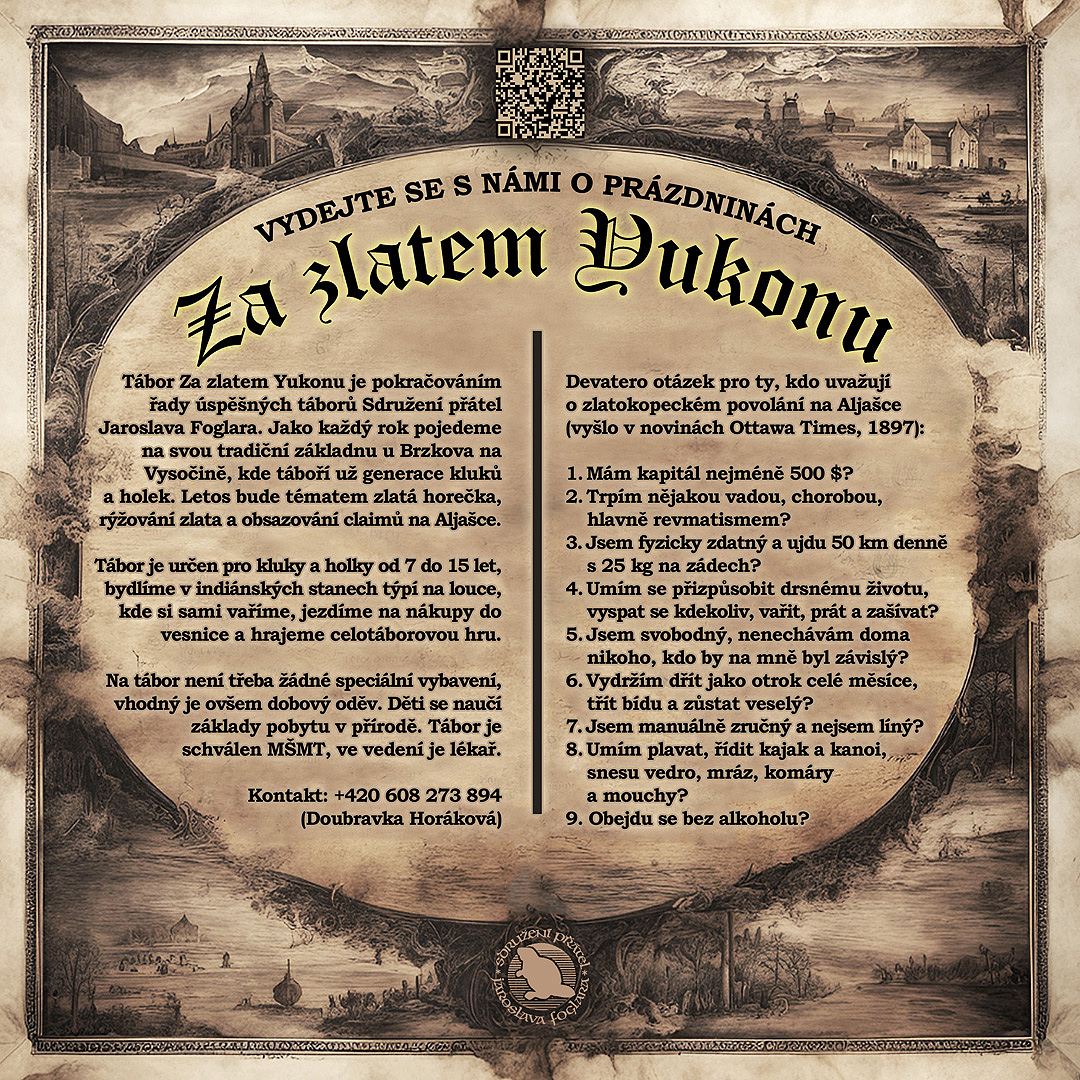Táborový život i program nás letos zanese o více než sto let zpátky, do drsné krajiny Kanadské části Aljašky, kde několik osamělých dobrodruhů objevilo na sklonu roku 1896 nebývale bohaté ložisko zlata. Valouny velikosti vajec se válely v potoce a čekaly miliony let na své objevení. Ještě behem podzimu a hlavně následujícího jara se strhla doslova zlatá horečka - nebývalá panika, která přivedla do drsné krajiny aljašských hor a říčních údolí tisíce dobrodruhů. Mysleli si, že jedou hledat zlato, ale nakonec se stala Zlatá horečka na Klondiku především synonymem mladistvé odvahy, dobrodružství, společného boje s drsnou přírodou a zážitků na celý život. Zbohatla tehdy sice jen hrstka zlatokopů, ale neuvěřitelné příběhy a zážitky vyprávěli otrlí mužové a ženy severu ještě po generace. A vyprávět si je budeme i my.