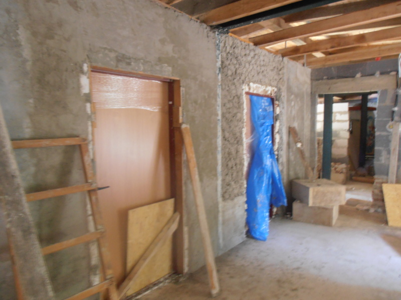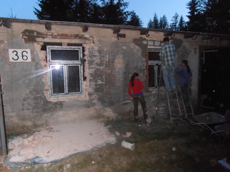 Celé pondělí jsme pracovali pouze ve třech (Sova, Drobek, Píďa), ale na výkonech to nebylo znát. Nejprve jsme s Píďou dokončili obložení stropu dřevěnými palubkami a začali výkop kolem budovy na budoucí obnovu drenáže, poté jsem já začal pokládat plovoucí podlahu a holky dodělávaly hrany nového okna. V pondělí večer dorazila první posila - Svišť a v úterý ráno druhá - Vojta. Celý čtvrtý den se nesl v tomto duchu - já dodělával podlahu, Píďa ořezávala zbytky folií z anhydritových podlah v jídelně, Svišť s Drobkem vysekávali díru na další okno a Vojta začal omítat (jídelnu).
