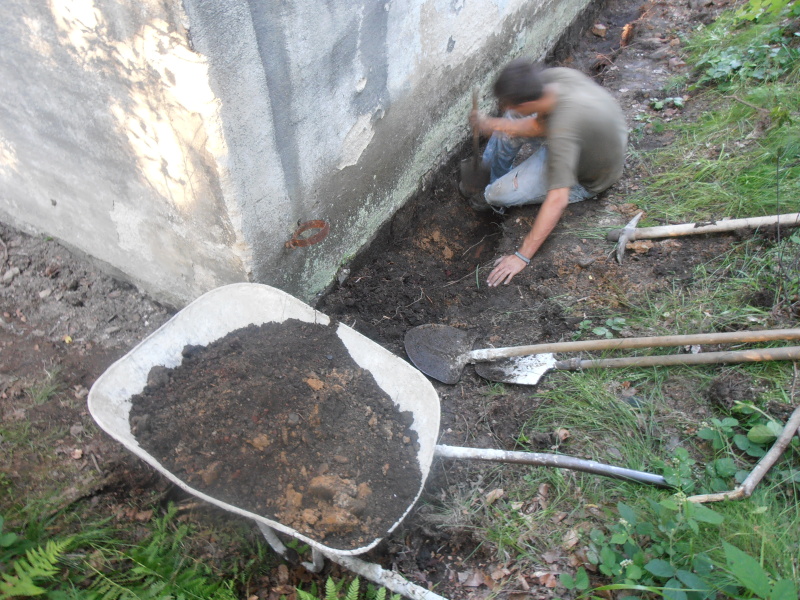 Ve středu přišla konečně na řadu jímka. Bylo potřeba vykopat díru větší než tři kubíky, proto jsme po zralé uváze objednali z Mikulovic bagr a nechali si tuto práci udělat o mnoho rychleji a jen o malinko dráž. Po středečním opětovném příjezdu Čápa jsme se pustili do betonování dna vzniklé díry, čili jakési základní desky pro jímku. Téhož dne dorazil dále Grif, který převzal po Vojtovi omítání aby ten se mohl věnovat drenáži. Půldenní posilou se také stala Pulec, která jednak pomohla s přípravou skvělého oběda, jednak částečně vymalovala v podstatě hotovou malou klubovnu.