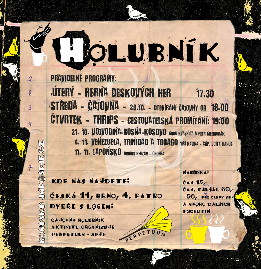ID ID stránky Titulek Úvod Text Tags Obrázek 1 Obrázek 2 Autor Datum vložení Datum publikování Zveřejnit Soukromý článek? Počet zobrazeníOd středy 20.10.2010 je v provozu nové volnočasové centrum Jihomoravské pobočky SPJF - Perpetua s poetickým názvem Holubník. Prostory upravené jako čajovna a promítací sál jsou v provozu 4 dny v týdnu*, vždy vpodvečer, každý den je připraven příjemný program.