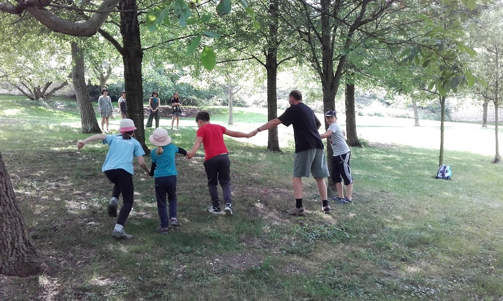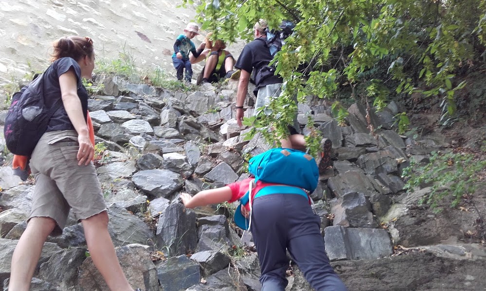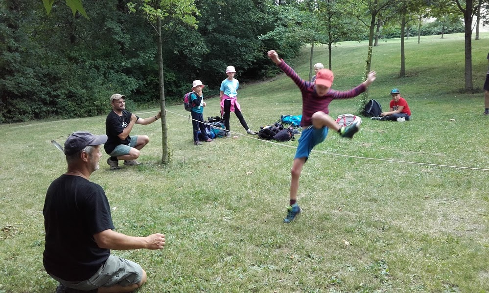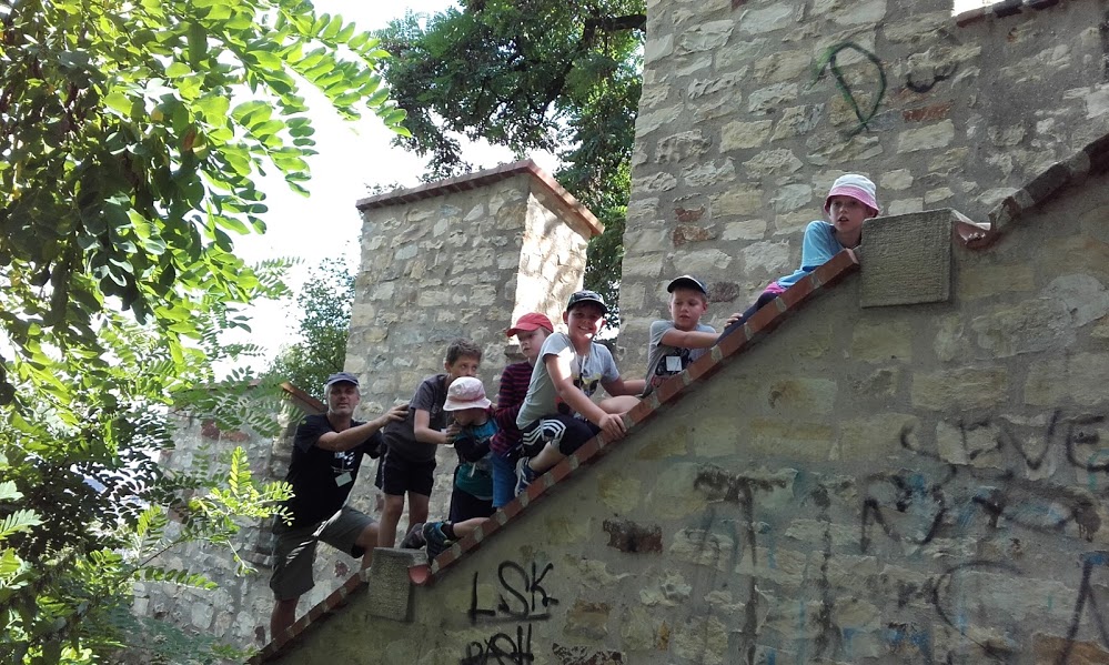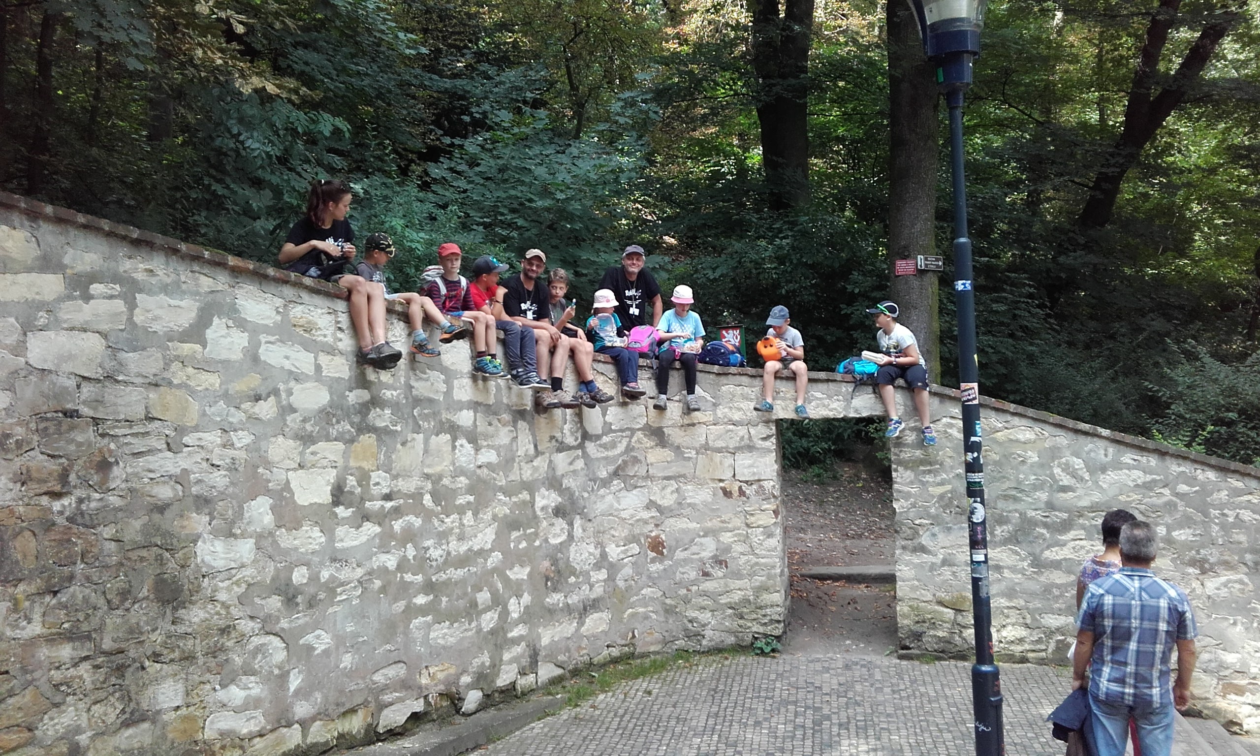 Pojedli jsme na hřebeni kamenné zdi nad schody, kde nám pod nohama chodili turisti. Dozvěděli jsme se něco o názvu kopce Petřín a z jedné pískovcové skály nad jeskyní Menža vysílal morseovku praporky. Nad skalami na plácku jsme se usídlili, abychom protáhli své kosti. Hráli jsme zde píďalky (zajímavá hra, zvláště pro asijské turisty, kteří tam zničehonic přišli z vysoké trávy), kdy jsme se ve skupinkách museli přemístit tak, abychom se nerozpojili a stále jsme byli jedním koncem na stromě. Dále jsme cvičili skákání přes mega švihadlo, skákání přes napnuté lano a legendární a velice vděčné "cukrkávalimonáda". Pozor na toho, kdo piká, zda neříká něco jiného a úplně všichni se pak nemusí vrátit 5 kroků zpět... :-)