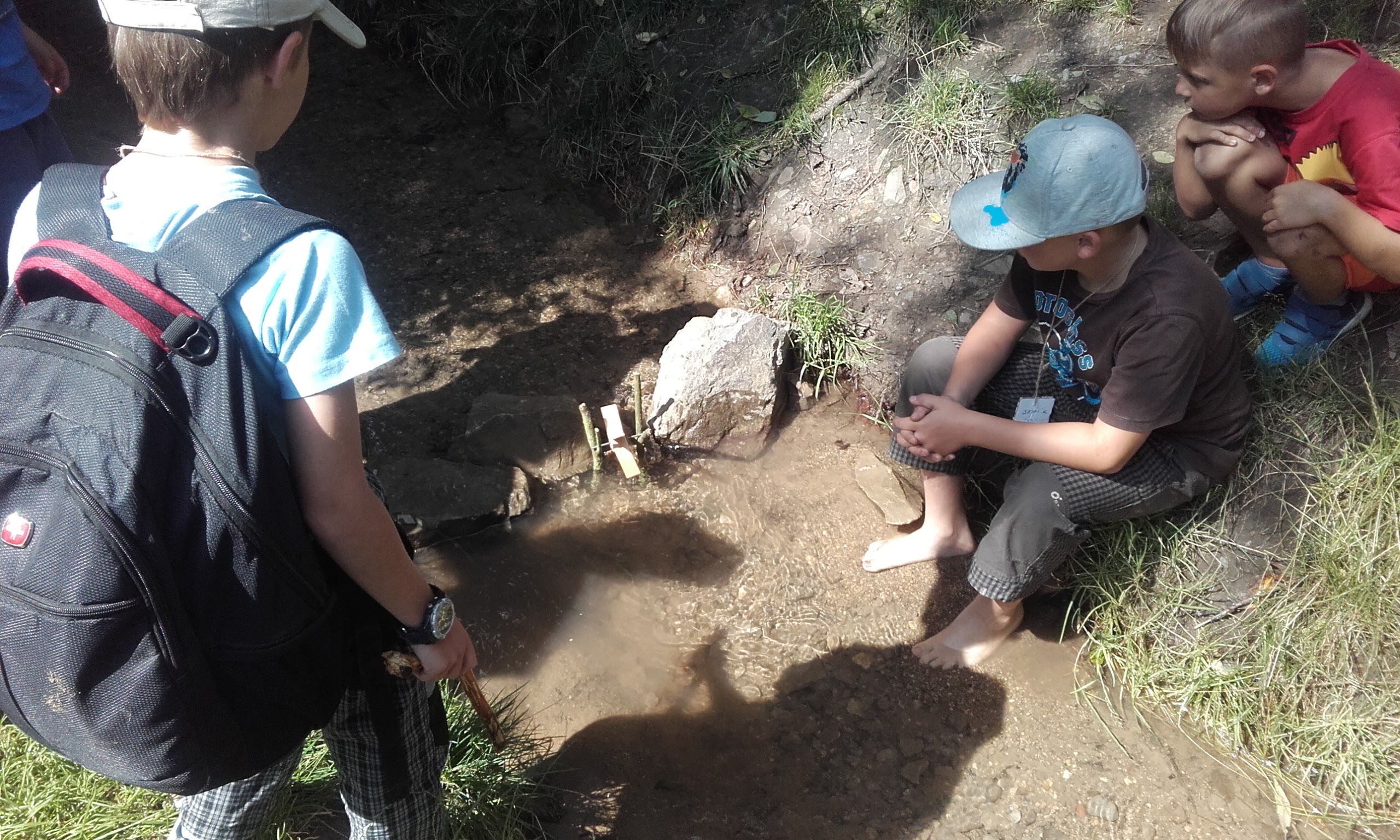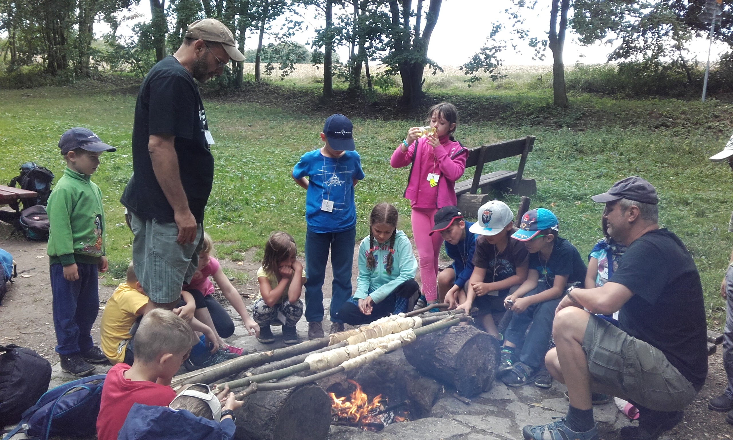 U potoka jsme i umyli ruce a usadili mlýnek, který jsme včera vyráběli s Tajlórem v klubovně. U pomníčku na místě úmrtí sokolského písmáka jsme se vyfotili a na nedalekém tábořišti jsme převzali od nějakých kluků ještě doutnající oheň a upekli si ty hady. Je to vlastně těsto, které jsme si připravili ráno v klubovně. Tajlór nesl tři hroudy těsta ve svém baťohu a u ohně zjistil, že má baťoh mnohem větší, protože mu těsto nakynulo.
