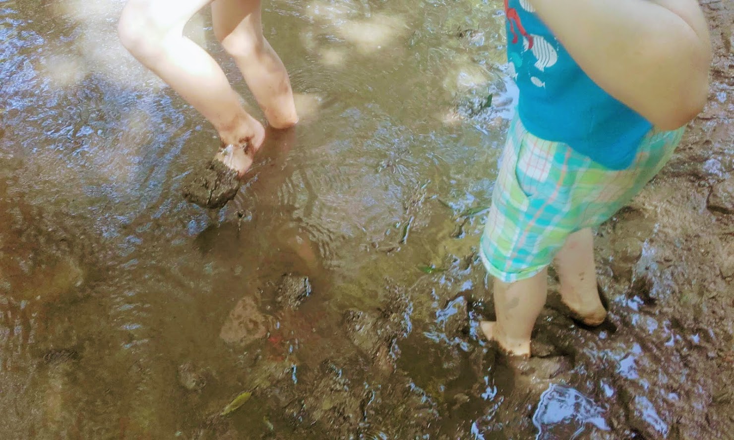 U potoka pouštíme papírové lodičky, pozorujeme žábu, běháme po kládě přes potok a zchlazujeme se. Menhart nám ukazuje na ruce klíště, které ho chce kousnout, ale zatím nenašlo měkkou část ruky. Byla to ale jen volavka - nakonec ho kouslo jiné.