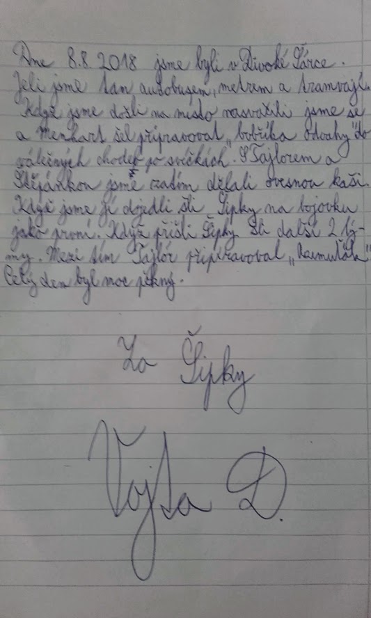 Středa, 8. srpna 2018, 3. den tábora – Šárka: Je opět velké horko, takže nejedeme tramvají, ale metrem, kde se to dá lépe přežít. V Šárce plníme bobříka odvahy, jdeme každý sám v podzemí – bývalém podzemním štábu polního letiště – po svíčkách a na konci cesty se podepisujeme. Ne všichni tohoto bobříka splnili. Ale v podzemí bylo příjemně - možná až chladno, takže přes poledne to bylo příjemné zchlazení.