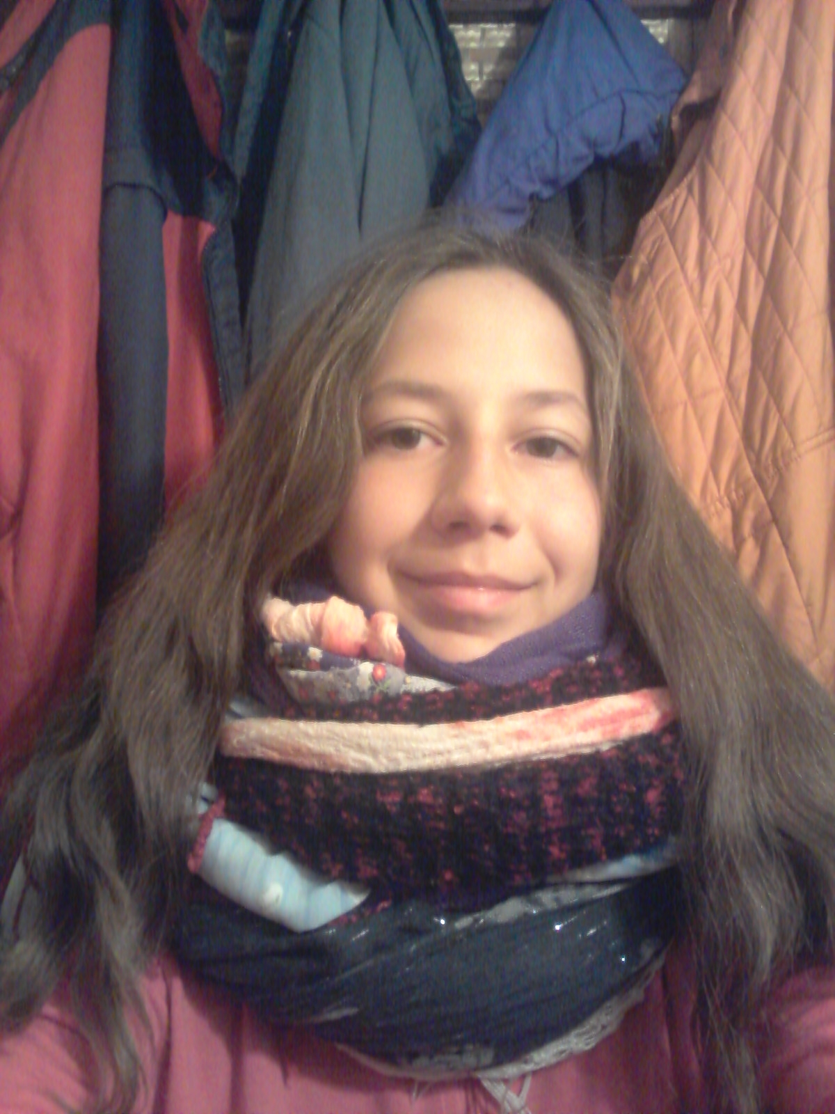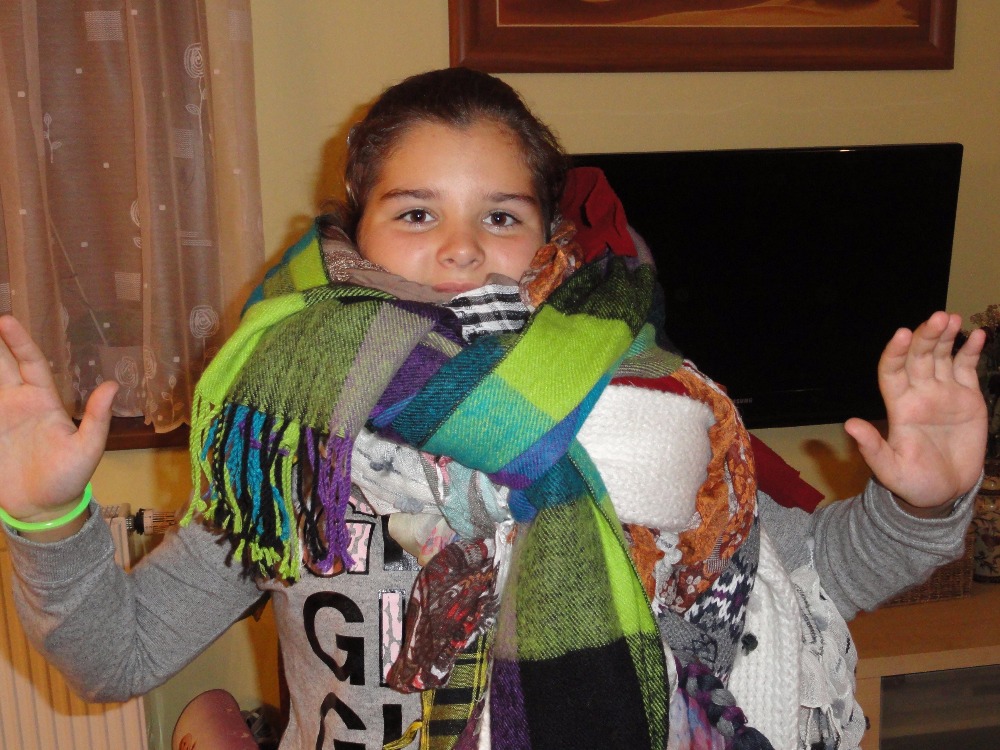 9. úkol byl zamotat se během půl minuty do co najvíce šátků a šál. Doubravka měla 18 a Jojo11 17, což sice není nejvíc, ale tohle nejvíc vypadalo, že drží. Nesoutěžní fotku jsme dostali i od Pepíka, bráchy Aničky a Tondy V.
